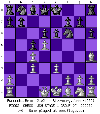 Last move : 1-0 2018 December 25 14:55:20 [Event "FICGS__CHESS__WCH_STAGE_1_GROUP_07__000020"] [Site "FICGS"] [Date "2018.11.01"] [Round "1"] [White "Pareschi,Remo"] [Black "Rivenburg,John"] [Result "1-0"] [WhiteElo "2102"] [BlackElo "1020"] 1.d4 Nf6 2.c4 e6 3.Nc3 Bb4 4.Bg5 c5 5.d5 h6 6.Bh4 Bxc3+ 7.bxc3 d6 8.e3 1-0 This chess game has been lost on time (started : 2018.11.01 15:27:39) Nimzo-Indian : Leningrad variation Player White won this chess game. Follow this game move after move (download)If cunning alone were needed to excel, women would be the best Chess players. (Albin) Spielt Blackmar-Diemer-Gambit, und das Matt kommt von selbst! (Emil Joseph Diemer) Evita las multitudes. Haz independientemente tu propio razonamiento. Trata de ser el jugador de Ajedrez, no la pieza de Ajedrez. (Ralph Charell) Toute estimation doit être constamment réévaluée. (Jacob Estrin) Tree pose grows confidence. It roots me to this world. (Terri Guillemets)