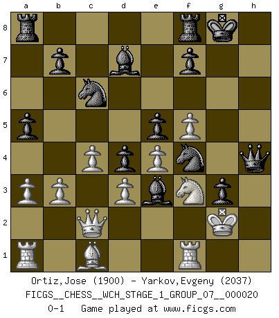 Last move : 0-1 2019 January 10 3:35:24 [Event "FICGS__CHESS__WCH_STAGE_1_GROUP_07__000020"] [Site "FICGS"] [Date "2018.11.01"] [Round "1"] [White "Ortiz,Jose"] [Black "Yarkov,Evgeny"] [Result "0-1"] [WhiteElo "1900"] [BlackElo "2037"] 1.c4 Nf6 2.Nf3 e6 3.e3 d5 4.b3 Be7 5.Be2 O-O 6.O-O c5 7.Bb2 Nc6 8.a3 d4 9.Qc2 a5 10.e4 Nh5 11.Re1 Nf4 12.Bf1 g5 13.g3 Ng6 14.Bg2 g4 15.Nxd4 cxd4 16.d3 Bd7 17.Nd2 e5 18.f3 Bg5 19.Rf1 h5 20.Bc1 Be3+ 21.Kh1 h4 22.f4 hxg3 23.f5 Qh4 24.h3 gxh3 25.Nf3 hxg2+ 26.Kxg2 Nf4+ 0-1 English Opening Kingside Castling by player Black (move 5) Kingside Castling by player White (move 6) Player Black won this chess game. Follow this game move after move (download)The way he plays Chess demonstrates a man's whole nature. (Stanley Ellin) Konzentriere dich auf materielle Gewinne. Nimm, was dir dein Gegner gibt, ausser es gibt einen guten Grund der dagegenspricht. (Robert James Fischer) Morphy probablemente fue el genio más grande de todos. (Bobby Fischer) Comme les marins qui ont mille raisons différentes d'aller en mer, les joueurs d'échecs en ont tout autant avant de s'installer devant une table et jouer... (Vincent Bertignac, philosophe) I find your interest interesting. (Gregory House, House M.D.)
