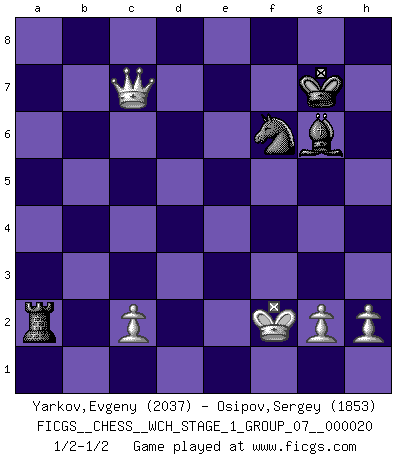Last move : 1/2-1/2 2018 December 12 10:55:2 [Event "FICGS__CHESS__WCH_STAGE_1_GROUP_07__000020"] [Site "FICGS"] [Date "2018.11.01"] [Round "1"] [White "Yarkov,Evgeny"] [Black "Osipov,Sergey"] [Result "1/2-1/2"] [WhiteElo "2037"] [BlackElo "1853"] 1.e4 c5 2.Nf3 d6 3.d4 cxd4 4.Nxd4 Nf6 5.Nc3 a6 6.Bg5 e6 7.f4 Qb6 8.Qd2 Qxb2 9.Rb1 Qa3 10.e5 h6 11.Bh4 dxe5 12.fxe5 g5 13.exf6 gxh4 14.Be2 Qa5 15.O-O Nd7 16.Kh1 Qg5 17.Rf4 e5 18.Nd5 exd4 19.Qxd4 Kd8 20.Ne7 Qe5 21.Qd2 Bxe7 22.fxe7+ Qxe7 23.Bg4 f5 24.Rxf5 Re8 25.Rd1 Kc7 26.Rf7 Qxf7 27.Qd6+ Kd8 28.Qb6+ Ke7 29.Re1+ Kf8 30.Qxh6+ Kg8 31.Rxe8+ Qxe8 32.Be6+ Qxe6 33.Qxe6+ Kg7 34.Qg4+ Kf7 35.Qh5+ Kg7 36.Qxh4 Nf6 37.Kg1 Bf5 38.Qg5+ Bg6 39.Qc5 Re8 40.Qc7+ Bf7 41.Qxb7 Re1+ 42.Kf2 Ra1 43.Qxa6 Rxa2 44.Qc8 Bg6 45.Qc7+ Kh6 46.Qf4+ Kg7 47.Qc7+ Kh6 48.Qf4+ Kg7 49.Qc7+ 1/2-1/2 Sicilian : Najdorf, 7...Qb6 Kingside Castling by player White (move 15) 10 pieces endgame at move 43 : White KQPPPP , Black KRBN WHITE : King + 1 Queen 4 Pawns BLACK : King + 1 Rook 1 Bishop 1 Knight 9 pieces endgame at move 43 : White KQPPP , Black KRBN WHITE : King + 1 Queen 3 Pawns BLACK : King + 1 Rook 1 Bishop 1 Knight This chess game ended in a draw. Follow this game move after move (download)Only sissies Castle. (Rob Sillars) Du weisst es gibt ein Problem mit Computern und Fernschach, wenn jeder eine Rating von 2450 hat. (John Christen Knudsen) Aquel que teme a un Peón de Reina aislado, debería de retirarse del Ajedrez. (Siegbert Tarrasch) Il n'y a plus de joueurs du niveau de Jacob Murray dont la seule quête est le beau jeu, le plaisir de voir les pièces construire quelque chose. Sur 10 idées à la minute, 9 seront sans intérêt, la dernière s'avèrera géniale. (Christian Bauer) Nobody is always a winner, and anybody who says he is, is either a liar or doesn't play poker. (Amarillo Slim)