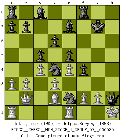 Last move : 0-1 2018 December 6 19:39:50 [Event "FICGS__CHESS__WCH_STAGE_1_GROUP_07__000020"] [Site "FICGS"] [Date "2018.11.01"] [Round "1"] [White "Ortiz,Jose"] [Black "Osipov,Sergey"] [Result "0-1"] [WhiteElo "1900"] [BlackElo "1853"] 1.e4 c5 2.c4 Nc6 3.Nf3 e5 4.Nc3 d6 5.Be2 Be7 6.O-O f5 7.d3 Nf6 8.h3 O-O 9.a3 Kh8 10.b3 Qe8 11.Ng5 f4 12.Nf3 g5 13.Nh2 h5 14.Nd5 g4 15.hxg4 Nxd5 16.gxh5 Nc3 17.Qc2 Nd4 18.Qb2 Ncxe2+ 19.Kh1 Qxh5 20.Re1 Kg7 21.Bd2 Qxh2+ 0-1 Sicilian defense Kingside Castling by player White (move 6) Kingside Castling by player Black (move 8) Player Black won this chess game. Follow this game move after move (download)Chess is the art of analysis. (Mikhail Botvinnik) Frage des Reporters: -Worin besteht das Ziel von Gambiteröffnungen? Antwort: -Auf Kosten der Partie einen Ruf als Angriffspieler zu erwerben.- (Siegbert Tarrasch) Al jugar al Ajedrez entonces, podemos aprender: Primero: Previsión... Segundo: Prudencia... Tercero: Cautela... Y al final, aprendemos del Ajedrez el hábito de no ser desanimados por apariencias malas presentes en el estado de nuestros asuntos, el hábito de la esperanza por una oportunidad favorable y la perseveración de los secretos de los recursos. (Benjamin Franklin) La guerre est enfant de la passion, la passion est enfant du narcissisme et le narcissisme est l'enfant. (...) Une autre partie ? (Thibault de Vassal) The human is the only animal species whose members are able to talk themselves into difficulties that would not otherwise exist. (Wendell Johnson)
