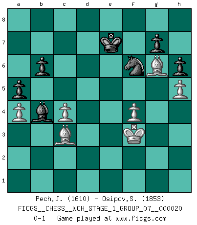 Last move : 0-1 2019 May 29 17:56:14 [Event "FICGS__CHESS__WCH_STAGE_1_GROUP_07__000020"] [Site "FICGS"] [Date "2018.11.01"] [Round "1"] [White "Pech,Jaroslav senior"] [Black "Osipov,Sergey"] [Result "0-1"] [WhiteElo "1610"] [BlackElo "1853"] 1.d4 Nf6 2.c4 e6 3.Nf3 b6 4.g3 Ba6 5.b3 Bb4+ 6.Bd2 Be7 7.Bg2 c6 8.Bc3 O-O 9.Nbd2 d5 10.Ne5 Qc7 11.Rc1 Nbd7 12.Nxd7 Qxd7 13.O-O Rfd8 14.e4 Rac8 15.Qf3 c5 16.exd5 cxd4 17.Bxd4 exd5 18.Bb2 dxc4 19.Nxc4 Bxc4 20.bxc4 h6 21.Qe2 Re8 22.Qc2 Qg4 23.Rfe1 Qg6 24.Bf3 Qxc2 25.Rxc2 Kf8 26.Kg2 Bc5 27.Rxe8+ Nxe8 28.a4 Rd8 29.Bc3 a5 30.h4 Nc7 31.Rd2 Rxd2 32.Bxd2 Ke7 33.Be4 Ne6 34.f4 Nd4 35.Bc3 Ne6 36.h5 Bd4 37.Bd2 Nc5 38.Bc2 f5 39.Kf3 Ke6 40.g4 fxg4+ 41.Kxg4 Kf6 42.Bc1 Nb7 43.Kf3 Nd6 44.Bb3 Kf5 45.Ba3 Ne8 46.Bc2+ Ke6 47.Bg6 Nd6 48.Bh7 Ne8 49.Bg8+ Kd7 50.Bd5 Nf6 51.Bf7 Kc6 52.Bf8 Nh7 53.Be8+ Kc7 54.Ba3 Nf6 55.Bg6 Kd8 56.Bd6 Bc5 57.Be5 Ke7 58.Ke2 Ke6 59.Kd3 Ke7 60.Bc3 Ke6 61.Bb2 Kd6 62.Ke2 Kd7 63.Kf3 Ke7 64.Be5 Ke6 65.Bc3 Bg1 66.Kg2 Be3 67.Kg3 Ke7 68.Kf3 Bc5 69.Bb2 Ke6 70.Ba1 Ke7 71.Bc3 Bb4 0-1 Alexander Marciz unreal delivery of the party Queen's Indian : Nimzovich variation (exaggerated Fianchetto) Kingside Castling by player Black (move 8) Kingside Castling by player White (move 13) Player Black won this chess game. Follow this game move after move (download)I play correspondence chess because it is both art and science while chess is art only. (A player at FICGS) Die jungen Leute sollen verstehen, dass sie noch etwas von mir lernen können und müssen. (Viktor Kortschnoi) Yo adoro todas la posiciones. Denme una partida posicional difícil, y la jugaré. Pero posiciones totalmente ganadas, no las tolero. (Hein Donner) Il vaut toujours mieux jouer un plan faux de façon logique que de n'avoir pas de plan du tout. (Victor Kortchnoï) There are two major products that came out of Berkeley: LSD and UNIX. We do not believe this is to be a coincidence. (Jeremy S. Anderson)