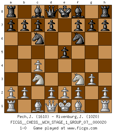 Last move : 1-0 2018 December 20 2:15:19 [Event "FICGS__CHESS__WCH_STAGE_1_GROUP_07__000020"] [Site "FICGS"] [Date "2018.11.01"] [Round "1"] [White "Pech,Jaroslav senior"] [Black "Rivenburg,John"] [Result "1-0"] [WhiteElo "1610"] [BlackElo "1020"] 1.c4 e5 2.Nc3 Nc6 3.Nf3 Nf6 4.g3 1-0 This chess game has been lost on time (started : 2018.11.01 15:27:39) English : Four knights, kingside Fianchetto Player White won this chess game. Follow this game move after move (download)You sit at the board and suddenly your heart leaps. Your hand trembles to pick up the piece and move it. But what Chess teaches you is that you must sit there calmly and think about whether it's really a good idea and whether there are other better ideas. (Stanley Kubrick) Taktik ist was man tun muß, wenn etwas zu tun ist. Strategie ist was man tun muß, wenn nichts zu tun ist. (Savielly Grigorievitsch Tartakower) Del Ajedrez se ha dicho que la vida no es lo suficientemente larga para él, pero eso es culpa de la vida, no del Ajedrez. (William Ewart Napier) Ce n'est pas pour s'amuser qu'il joue aux échecs : il célèbre un culte. (Vladimir Nabokov) If you ain't just a little scared when you enter a casino, you are either very rich or you haven't studied the games enough. (Pappy)