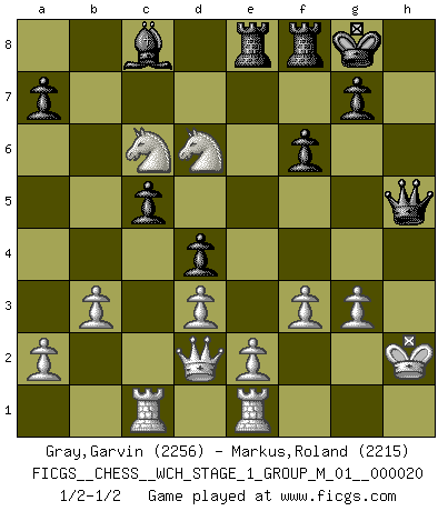 Last move : 1/2-1/2 2019 February 4 6:42:45 [Event "FICGS__CHESS__WCH_STAGE_1_GROUP_M_01__000020"] [Site "FICGS"] [Date "2018.11.01"] [Round "1"] [White "Gray,Garvin"] [Black "Markus,Roland"] [Result "1/2-1/2"] [WhiteElo "2256"] [BlackElo "2215"] 1.c4 Nf6 2.Nc3 c5 3.g3 d5 4.cxd5 Nxd5 5.Bg2 Nc7 6.d3 e5 7.Be3 Be7 8.Rc1 Ne6 9.Nf3 Nc6 10.Na4 Qa5+ 11.Nc3 O-O 12.O-O Rb8 13.Nd2 Qd8 14.Bxc6 bxc6 15.Nc4 f6 16.b3 Nd4 17.f3 Bh3 18.Re1 Be6 19.Na4 Bh3 20.Nc3 Be6 21.Na4 Bh3 22.Bd2 Qd7 23.Bc3 h5 24.Bb2 h4 25.Nc3 Rbd8 26.Ne4 hxg3 27.hxg3 Qf5 28.Na5 Qg6 29.Bxd4 exd4 30.Nxc6 Rde8 31.Kh2 Bc8 32.Qd2 Bd6 33.Nxd6 Qh5+ 1/2-1/2 English Opening Kingside Castling by player Black (move 11) Kingside Castling by player White (move 12) This chess game ended in a draw. Follow this game move after move (download)The passed pawn is a criminal, who should be kept under lock and key. Mild measures, such as police surveillance, are not sufficient. (Nimzovitch) Offensichtlich kennt Kasparow nichts anderes als Schach, und ich könnte 500 weitere Spieler dieser Sorte benennen. (Judith Polgar) Fischer sacrificó virtualmente todo lo que la mayoría de nosotros los 'debiles' (término que él usa) valoramos, respetamos y apreciamos por el amor de un astuto, a menudo hermoso tablero de juego, por el privilegio ambivalente de ser su mas grande maestro. (Paul Kollar) Fischer est le meilleur joueur du monde et Karpov n'est qu'un joueur de bistrot. (Garry Kasparov, agé de 16 ans) Heh, heh, heh. Time to abandon ship. (General Grievous in Star Wars ep.3)