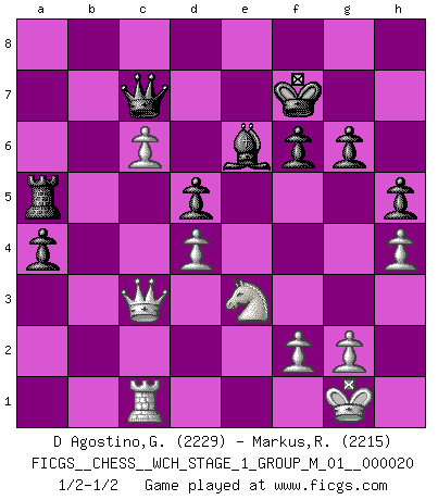 Last move : 1/2-1/2 2019 March 12 20:52:54 [Event "FICGS__CHESS__WCH_STAGE_1_GROUP_M_01__000020"] [Site "FICGS"] [Date "2018.11.01"] [Round "1"] [White "D Agostino,Gabriele"] [Black "Markus,Roland"] [Result "1/2-1/2"] [WhiteElo "2229"] [BlackElo "2215"] 1.e4 e5 2.Nf3 Nc6 3.Bb5 Nf6 4.O-O Nxe4 5.Re1 Nd6 6.Nxe5 Be7 7.Bf1 Nxe5 8.Rxe5 O-O 9.d4 Bf6 10.Re1 Re8 11.c3 Rxe1 12.Qxe1 Ne8 13.Bf4 d5 14.Nd2 Bf5 15.Qe3 c6 16.Re1 Nd6 17.Qg3 Bh4 18.Qf3 Bg5 19.h4 Bxf4 20.Qxf4 h5 21.c4 g6 22.c5 Ne8 23.Nf3 Ng7 24.b4 b5 25.Qd2 a5 26.Ne5 Qc7 27.a4 bxa4 28.b5 cxb5 29.Bxb5 a3 30.Qa2 Ne6 31.Bd7 Qb7 32.Bxe6 Bxe6 33.Qxa3 Bf5 34.Ra1 a4 35.c6 Qa7 36.Rc1 Qc7 37.Rc5 Rb8 38.Rc1 f6 39.Nf3 Ra8 40.Nd2 Kf7 41.Nf1 Ra6 42.Qc5 Be6 43.Ne3 Ra5 44.Qc3 1/2-1/2 Ruy Lopez : Berlin defense, Open variation Kingside Castling by player White (move 4) Kingside Castling by player Black (move 8) This chess game ended in a draw. Follow this game move after move (download)Good offense and good defense both begin with good development. (Bruce A. Moon) Du weisst es gibt ein Problem mit Computern und Fernschach, wenn jeder eine Rating von 2450 hat. (John Christen Knudsen) Debemos de asegurarnos de que el Ajedrez no se convierta en un lenguaje muerto, muy interesante, pero tan solo para un grupo muy pequeño. (Sytze Faber) La vie et les Echecs sont tous les deux une lutte constante. (Lasker) The Internet isn't free. It just has an economy that makes no sense to capitalism. (Brad Shapcott)