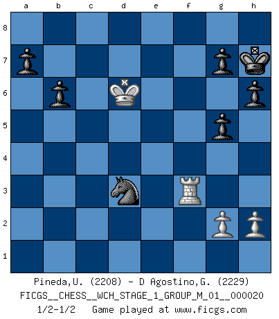 Last move : 1/2-1/2 2019 March 25 13:50:18 [Event "FICGS__CHESS__WCH_STAGE_1_GROUP_M_01__000020"] [Site "FICGS"] [Date "2018.11.01"] [Round "1"] [White "Pineda,Ulises"] [Black "D Agostino,Gabriele"] [Result "1/2-1/2"] [WhiteElo "2208"] [BlackElo "2229"] 1.d4 Nf6 2.c4 e6 3.Nc3 Bb4 4.f3 d5 5.a3 Bxc3+ 6.bxc3 c5 7.cxd5 exd5 8.e3 O-O 9.Bd3 b6 10.Ne2 Re8 11.O-O Nc6 12.Rb1 Na5 13.Qe1 Bb7 14.Ng3 cxd4 15.cxd4 Rc8 16.a4 Rc7 17.Qf2 Rc3 18.Qe2 Rc7 19.Qf2 Rc3 20.Rd1 Qd7 21.Bb2 Rb3 22.Rbc1 Bc6 23.e4 dxe4 24.fxe4 Bxe4 25.Bb5 Rxb5 26.axb5 Bd5 27.Re1 Nc4 28.Rxe8+ Nxe8 29.Re1 h6 30.Nh5 Be6 31.Nf4 Bf5 32.Nd5 Be6 33.Nc3 Nxb2 34.d5 Bxd5 35.Nxd5 Nd3 36.Ne7+ Kh8 37.Ng6+ fxg6 38.Qf8+ Kh7 39.Rxe8 Qd4+ 40.Kf1 Qa1+ 41.Ke2 Nc1+ 42.Kf2 Qd4+ 43.Ke1 Nd3+ 44.Kf1 Qa1+ 45.Ke2 Nc1+ 46.Ke3 Qc3+ 47.Ke4 Qc4+ 48.Ke5 Qxb5+ 49.Kd6 Qc5+ 50.Kd7 Qxf8 51.Rxf8 Nd3 52.Kd6 g5 53.Rf3 1/2-1/2 Nimzo-Indian : Kmoch variation Kingside Castling by player Black (move 8) Kingside Castling by player White (move 11) This chess game ended in a draw. Follow this game move after move (download)Strategy requires thought, tactics require observation. (Max Euwe) Ich suche im Schach immer etwas Eigenes. Riskantes Spiel im Stile schachlicher Musketiere ist nicht meine Sache, auch wenn es vielen Freunden scharfer Wendungen gefällt. (Anatoly Karpov) ¿Que sería del Ajedrez sin errores graciosos?. (Kurt Richter) Le profane ne songe pas à la somme de jouissance dont il se prive, qui méconnaît ce jeu aux ressources aussi variées que passionnantes. (Jean-Marie Jeanton-Lamarche) Fortune favours the audacious. (Desiderius Erasmus)