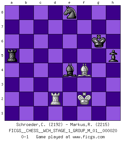 Last move : 0-1 2019 April 15 23:23:38 [Event "FICGS__CHESS__WCH_STAGE_1_GROUP_M_01__000020"] [Site "FICGS"] [Date "2018.11.01"] [Round "1"] [White "Schroeder,Christoph"] [Black "Markus,Roland"] [Result "0-1"] [WhiteElo "2192"] [BlackElo "2215"] 1.e4 e5 2.f4 exf4 3.Nf3 g5 4.h4 g4 5.Ne5 Nf6 6.Bc4 d5 7.exd5 Bd6 8.d4 Nh5 9.Nc3 O-O 10.Ne4 f5 11.Ng5 Nd7 12.Qd3 b5 13.Bxb5 Nxe5 14.dxe5 Bxe5 15.Bd2 Rb8 16.O-O-O a6 17.Rhe1 Bxb2+ 18.Kxb2 Rxb5+ 19.Ka1 h6 20.c4 Rb6 21.Nf3 gxf3 22.gxf3 Rg6 23.Bc3 Rf7 24.c5 Kh7 25.c6 a5 26.Qe2 Ng7 27.Bxa5 Qxh4 28.Bb4 Rg3 29.Rh1 Qd8 30.Rhe1 Qg5 31.Kb1 h5 32.a4 Rg2 33.Qd3 Qg3 34.Rf1 Qh2 35.Rh1 Rb2+ 36.Kc1 Qg2 37.Rhg1 Qf2 38.Rgf1 Qe2 39.Qxe2 Rxe2 40.Rd4 Ne8 41.Rxf4 Rg7 42.Re1 R7g2 43.Rxe2 Rxe2 44.Kd1 Re5 45.Rd4 Ba6 46.Kd2 Kg6 47.a5 Re2+ 48.Kd1 Re3 49.d6 cxd6 50.Bxd6 Re6 51.Bg3 Rxc6 52.Ke1 Re6+ 53.Kf2 Re2+ 54.Kg1 Bb7 55.Rd3 Ra2 56.Be1 Kg5 57.Bd2+ f4 58.Rd4 Bxf3 59.Bxf4+ Kg6 60.Rd2 Rxa5 61.Kf2 Be4 0-1 KGA : Kieseritsky, Berlin defense, 6.Bc4 Kingside Castling by player Black (move 9) Queenside Castling by player White (move 16) 10 pieces endgame at move 58 : White KRBP , Black KRBNPP WHITE : King + 1 Rook 1 Bishop 1 Pawn BLACK : King + 1 Rook 1 Bishop 1 Knight 2 Pawns 9 pieces endgame at move 59 : White KRBP , Black KRBNP WHITE : King + 1 Rook 1 Bishop 1 Pawn BLACK : King + 1 Rook 1 Bishop 1 Knight 1 Pawn 8 pieces endgame at move 60 : White KRB , Black KRBNP WHITE : King + 1 Rook 1 Bishop BLACK : King + 1 Rook 1 Bishop 1 Knight 1 Pawn Player Black won this chess game. Follow this game move after move (download)Chess is a more highly symbolic game, but the aggressions are therefore even more frankly represented in the play. It probably began as a war game; that is, the representation of a miniature battle between the forces of two kingdoms. (Karl Meninger) Ja, jede Frau in Holland liebt mich bestimmt, und alle Männer hassen mich. (Loek van Wely) Debió haber existido una vez en que los hombres eran semidióses, de otra manera no hubiesen podido inventar el Ajedrez. (Gustav Schenk) Vouloir jouer aux échecs contre soi-même est aussi paradoxal que vouloir marcher sur son ombre. (Stefan Zweig) The meaning of life is that it is to be lived, and it is not to be traded and conceptualized and squeezed into a pattern of systems. (Bruce Lee)