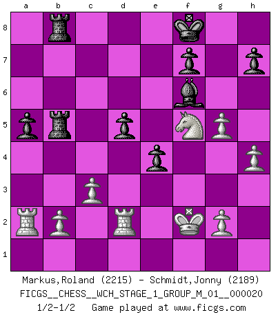 Last move : 1/2-1/2 2019 January 29 22:50:14 [Event "FICGS__CHESS__WCH_STAGE_1_GROUP_M_01__000020"] [Site "FICGS"] [Date "2018.11.01"] [Round "1"] [White "Markus,Roland"] [Black "Schmidt,Jonny"] [Result "1/2-1/2"] [WhiteElo "2215"] [BlackElo "2189"] 1.e4 c5 2.Nf3 Nc6 3.d4 cxd4 4.Nxd4 Nf6 5.Nc3 e5 6.Ndb5 d6 7.Bg5 a6 8.Na3 b5 9.Bxf6 gxf6 10.Nd5 Bg7 11.Bd3 Ne7 12.Nxe7 Qxe7 13.O-O d5 14.c3 O-O 15.Nc2 f5 16.exf5 e4 17.Be2 Rd8 18.a4 bxa4 19.Rxa4 Bxf5 20.Nd4 Qg5 21.h4 Qf6 22.Bg4 Bxg4 23.Qxg4 Qg6 24.Qf4 Re8 25.Nf5 Be5 26.Qg5 Bf6 27.Qg3 Qxg3 28.fxg3 Bd8 29.Kf2 Rb8 30.Ra2 a5 31.g4 Re6 32.Rd1 Reb6 33.Rd2 Rb5 34.Kf1 Bf6 35.Kf2 Kf8 36.g5 1/2-1/2 Sicilian : Pelikan (Lasker/Sveshnikov) variation Kingside Castling by player White (move 13) Kingside Castling by player Black (move 14) This chess game ended in a draw. Follow this game move after move (download)All my games are real. (Bobby Fischer) Ein Springer auf f6 gegen die eigene Rochadestellung ist schlimmer als ein rostiger Nagel im Knie. (Efim Bogoljubov) En el tablero, la mentira e hipocresía no sobreviven mucho. (Emanuel Lasker) Les échecs, c'est l'imagination. (David Bronstein) When you don't know what to do, walk fast and look worried. (Anonymous)