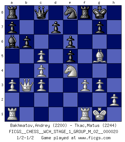 Last move : 1/2-1/2 2018 December 14 2:13:37 [Event "FICGS__CHESS__WCH_STAGE_1_GROUP_M_02__000020"] [Site "FICGS"] [Date "2018.11.01"] [Round "1"] [White "Bakhmatov,Andrey"] [Black "Tkac,Matus"] [Result "1/2-1/2"] [WhiteElo "2200"] [BlackElo "2244"] 1.d4 Nf6 2.c4 e6 3.Nc3 Bb4 4.f3 O-O 5.a3 Bxc3+ 6.bxc3 b6 7.e4 Nc6 8.e5 Ne8 9.Bd3 Ba6 10.Nh3 Qh4+ 11.Nf2 Na5 12.g3 Qd8 13.Qe2 c5 14.dxc5 Nb3 15.Bxh7+ Kxh7 16.Qc2+ Kg8 17.Qxb3 f6 18.Ne4 fxe5 19.O-O Qc8 20.Bg5 1/2-1/2 Nimzo-Indian : Kmoch variation Kingside Castling by player Black (move 4) Kingside Castling by player White (move 19) This chess game ended in a draw. Follow this game move after move (download)A chess genius has died; a loss for humanity. (Viktor Kortchnoi, about Bobby Fischer's death) Er war ein guter Schachspieler, aber ich kann Leute nicht ausstehen, die 'Heil Hitler' rufen (Über Alexander Aljechin). (Miguel Najdorf) Una clavada es mas poderosa que una espada. (Fred Reinfeld) Toutes les manuvres exécutées sur une colonne ouverte ont pour but ultime l'intrusion définitive sur la septième ou la huitième rangée, en plein cur de la position ennemie. (Aaron Nimzovitch) It is the aim of the modern school, not to treat every position according to one general law, but according to the principle inherent in the position. (Richard Reti)