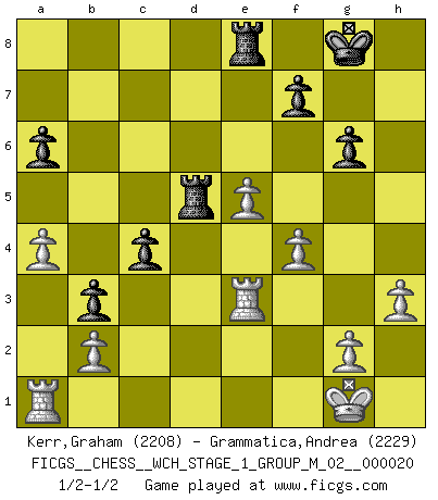 Last move : 1/2-1/2 2019 January 20 13:49:51 [Event "FICGS__CHESS__WCH_STAGE_1_GROUP_M_02__000020"] [Site "FICGS"] [Date "2018.11.01"] [Round "1"] [White "Kerr,Graham"] [Black "Grammatica,Andrea"] [Result "1/2-1/2"] [WhiteElo "2208"] [BlackElo "2229"] 1.e4 e5 2.Nf3 Nc6 3.Bb5 a6 4.Ba4 Nf6 5.O-O Be7 6.d3 b5 7.Bb3 d6 8.a4 Bd7 9.c3 Na5 10.Bc2 c5 11.Re1 O-O 12.Nbd2 Qb6 13.Nf1 b4 14.d4 b3 15.Bb1 cxd4 16.cxd4 exd4 17.Nxd4 Ng4 18.Ne3 Bf6 19.Nxg4 Bxg4 20.Qxg4 Bxd4 21.Qe2 Rfc8 22.Bd3 h6 23.h3 Rc6 24.Bf4 Rac8 25.e5 d5 26.Bf5 Rf8 27.Rad1 g6 28.Bd3 Nc4 29.Bxc4 dxc4 30.Bxh6 Re8 31.Be3 Bxe3 32.Qxe3 Qxe3 33.Rxe3 Rc5 34.f4 Ra5 35.Ra1 Rd5 1/2-1/2 Ruy Lopez : Closed defense Kingside Castling by player White (move 5) Kingside Castling by player Black (move 11) This chess game ended in a draw. Follow this game move after move (download)The tactician knows what to do when there is something to do; whereas the strategian knows what to do when there is nothing to do. (Gerald Abrahams) Mit sehr nachdenklichem Gesicht schreitet Bobby durch den Turniersaal. Was ist passiert?, fragt Lombardy. Ich stehe schlecht, antwortet Fischer. Lombardy: Dann biete doch einfach Remis an. Fischer: So schlecht stehe ich nun auch wieder nicht! (Robert James Fischer) Con el tiempo, empecé a progresar en partidas decisivas. Tal vez porque me di cuenta de una simple verdad: no solo estaba yo nervioso sino también mi oponente. (Mikhail Tal) Les Echecs ont trois composantes : le temps, l'espace et le matériel en dernier. (Mikhail Tal) Luck never made a man wise. (Seneca, Letters to Lucilius)