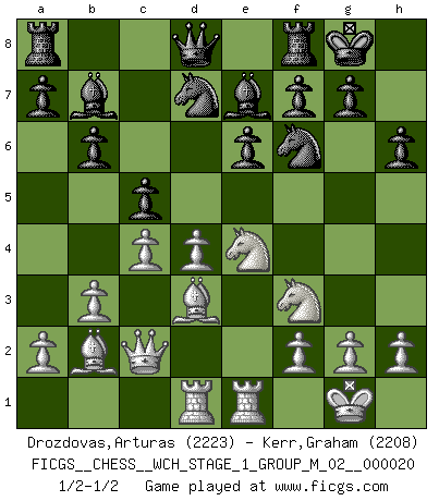Last move : 1/2-1/2 2018 December 15 0:3:5 [Event "FICGS__CHESS__WCH_STAGE_1_GROUP_M_02__000020"] [Site "FICGS"] [Date "2018.11.01"] [Round "1"] [White "Drozdovas,Arturas"] [Black "Kerr,Graham"] [Result "1/2-1/2"] [WhiteElo "2223"] [BlackElo "2208"] 1.d4 d5 2.c4 c6 3.Nf3 e6 4.b3 Nf6 5.e3 b6 6.Bd3 Bd6 7.Nbd2 O-O 8.O-O Bb7 9.Qc2 h6 10.Bb2 Nbd7 11.Rfe1 c5 12.e4 dxe4 13.Nxe4 Be7 14.Rad1 1/2-1/2 QGD Slav : 3.Nf3 Kingside Castling by player Black (move 7) Kingside Castling by player White (move 8) This chess game ended in a draw. Follow this game move after move (download)Every Pawn is a potential Queen. (James Mason) Ein Schachspiel besteht aus drei Phasen: Die erste, wenn du hofftst den Vorteil zu haben, die zweite, wenn du glaubst einen Vorteil zu haben, und die dritte.... wenn du weißt Du wirst verlieren. (Savielly Grigorievitsch Tartakower) Muchos se han convertido en Maestros de Ajedrez, nadie se ha convertido en el Maestro del Ajedrez. (Siegbert Tarrasch) Je fais ceci parce que dans cinquante coups j'obtiendrai cela; je m'appelle Mikhail Moisevitch Botvinnik. (Botvinnik) Experiences are the keys to life. (Daniel Parmet)