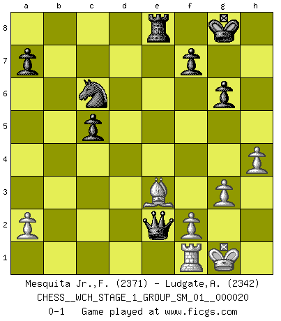 Last move : 0-1 2018 November 27 15:33:10 [Event "FICGS__CHESS__WCH_STAGE_1_GROUP_SM_01__000020"] [Site "FICGS"] [Date "2018.11.01"] [Round "1"] [White "Mesquita Jr.,Fausto Monteiro"] [Black "Ludgate,Alan"] [Result "0-1"] [WhiteElo "2371"] [BlackElo "2342"] 1.d4 Nf6 2.c4 g6 3.Nc3 Bg7 4.Nf3 O-O 5.g3 d5 6.cxd5 Nxd5 7.Bg2 Nxc3 8.bxc3 c5 9.O-O Nc6 10.d5 Na5 11.Bf4 e6 12.dxe6 Bxe6 13.Qc2 Qe7 14.Ng5 Bf5 15.e4 Bd7 16.e5 Bc6 17.Rfe1 Bxg2 18.Kxg2 h6 19.Ne4 Nc6 20.Nf6+ Bxf6 21.exf6 Qxf6 22.Bxh6 Rfe8 23.h4 Ne5 24.Qe4 Nc6 25.Qd3 Ne5 26.Qd5 Rad8 27.Qxb7 Nd3 28.Rxe8+ Rxe8 29.Be3 Qxc3 30.Rf1 Qc2 31.Kg1 Ne5 32.Qd5 Qe2 33.Qc6 Nxc6 0-1 King's Indian defense, 3.Nc3 Kingside Castling by player Black (move 4) Kingside Castling by player White (move 9) Player Black won this chess game. Follow this game move after move (download)Chess is life. (Bobby Fischer) Glücklicherweise sind Großmeister Ruben Fines reine Schachbücher weniger phallozentrisch [als seine Schachpsychologie] und deswegen auch weniger lächerlich. (Nigel Short) Yo nunca en mi vida he jugado la Defensa Francesa, que viene siendo la más aburrida de todas las Aperturas. (Wilhelm Steinitz) La victoire dans une partie d'Echecs appartient la plupart du temps à celui qui voit un peu plus loin que l'adversaire. (Lasker) In my experience, there's no such thing as luck. (Obi-Wan Kenobi in Star Wars ep.4)