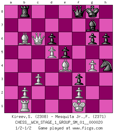 Last move : 1/2-1/2 2018 December 4 18:23:26 [Event "FICGS__CHESS__WCH_STAGE_1_GROUP_SM_01__000020"] [Site "FICGS"] [Date "2018.11.01"] [Round "1"] [White "Kireev,Sergey"] [Black "Mesquita Jr.,Fausto Monteiro"] [Result "1/2-1/2"] [WhiteElo "2308"] [BlackElo "2371"] 1.e4 c5 2.Nf3 d6 3.d4 cxd4 4.Nxd4 Nf6 5.Nc3 a6 6.Be3 e5 7.Nb3 Be6 8.Be2 Be7 9.Qd3 O-O 10.O-O Nc6 11.a3 Nd7 12.Rad1 Rc8 13.Qd2 h6 14.Rfe1 Re8 15.h3 Nf6 16.Bf3 Bf8 17.Nd5 Bxd5 18.exd5 Ne7 19.Qd3 b5 20.c3 g6 21.g4 Bg7 22.Nd2 Nh7 23.a4 f5 24.axb5 axb5 25.Qxb5 Rb8 26.Qa6 f4 27.Ba7 Ra8 28.Ra1 Ng5 29.Qb5 Nxh3+ 30.Kg2 Ng5 31.Ne4 Nf5 32.Bb6 Nh4+ 33.Kf1 Qe7 34.Bh1 Nxe4 35.Bxe4 f3 36.Qc6 Qf8 37.Rxa8 Rxa8 38.Rb1 Rb8 1/2-1/2 Sicilian : Najdorf, Byrne (English) attack Kingside Castling by player Black (move 9) Kingside Castling by player White (move 10) This chess game ended in a draw. Follow this game move after move (download)Human affairs are like a Chess game: only those who do not take it seriously can be called good players. (Hung Tzu Ch'eng) Die unerbitterlichsten Regeln im Schach sind die Ausnahmen. (Savielly Grigorievitsch Tartakower) La maestría del Ajedrez consiste esencialmente en analizar posiciónes de Ajedrez con precisión. (Mikhail Botvinnik) Les pièces de l'échiquier étaient impitoyables. Elles le retenaient, elles l'absorbaient. Il y avait de l'horreur en cela, mais aussi une harmonie unique. Car, qu'y a-t-il dans le monde, à part les échecs ? (V. Nabokov) When you stop learning you start dying. (Scott Adams)