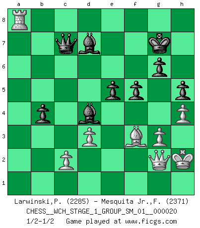 Last move : 1/2-1/2 2018 December 11 22:37:24 [Event "FICGS__CHESS__WCH_STAGE_1_GROUP_SM_01__000020"] [Site "FICGS"] [Date "2018.11.01"] [Round "1"] [White "Larwinski,Paul"] [Black "Mesquita Jr.,Fausto Monteiro"] [Result "1/2-1/2"] [WhiteElo "2285"] [BlackElo "2371"] 1.e4 c5 2.Nc3 d6 3.Nge2 Nf6 4.g3 g6 5.Bg2 Bg7 6.O-O Nc6 7.d3 O-O 8.h3 Rb8 9.f4 e6 10.Be3 b5 11.a3 a5 12.e5 Nd5 13.Bf2 Nxc3 14.Nxc3 b4 15.Ne4 dxe5 16.Bxc5 exf4 17.Bxf8 Qxf8 18.Rxf4 Bxb2 19.axb4 axb4 20.Ra2 Be5 21.Nf6+ Kg7 22.Bxc6 Bxf6 23.Qf3 Qe7 24.Rc4 Rb6 25.Be4 Ra6 26.Rxa6 Bxa6 27.Rc6 Bb5 28.Rc8 Qd7 29.Ra8 Qc7 30.Ra2 Bd4+ 31.Kh2 Bd7 32.Qg2 f5 33.Bf3 e5 34.Ra8 h5 35.h4 Qd6 36.Rd8 Qc7 37.Ra8 Qd6 38.Rd8 Qc7 39.Ra8 1/2-1/2 Sicilian : Closed Kingside Castling by player White (move 6) Kingside Castling by player Black (move 7) This chess game ended in a draw. Follow this game move after move (download)You cannot play at Chess if you are kind-hearted. (French Proverb) Ich war schon mal beim Dopingtest. Da musste ich Urin abgeben, während Dritte zusahen. (Elisabeth Pähtz) El juego de Fischer siempre fue nÃtido, racional y brillante. Uno de los mejores por siempre. (Dave Regis) Il s'avisa de me proposer d'apprendre les échecs qu'il jouait un peu... me voilà forcené des échecs. J'achète un échiquier, je m'enferme dans ma chambre, j'y passe des jours et des nuits à vouloir apprendre par cœur toutes les parties. (Jean-Jacques Rousseau, Confessions) Empty your mind, be formless, shapeless — like water. (Bruce Lee)