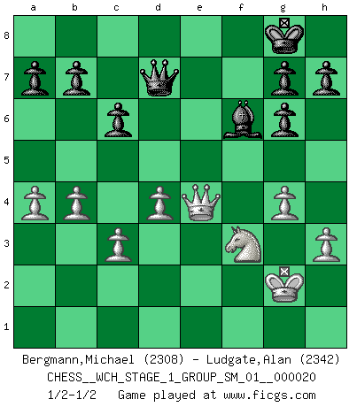 Last move : 1/2-1/2 2019 January 2 8:6:26 [Event "FICGS__CHESS__WCH_STAGE_1_GROUP_SM_01__000020"] [Site "FICGS"] [Date "2018.11.01"] [Round "1"] [White "Bergmann,Michael"] [Black "Ludgate,Alan"] [Result "1/2-1/2"] [WhiteElo "2308"] [BlackElo "2342"] 1.e4 e5 2.Nf3 Nf6 3.Nxe5 d6 4.Nf3 Nxe4 5.d4 d5 6.Bd3 Be7 7.O-O Nc6 8.Nbd2 Nxd2 9.Bxd2 Bg4 10.c3 O-O 11.h3 Bh5 12.g3 Qd7 13.Kg2 Bg6 14.Bxg6 fxg6 15.Qc2 Rae8 16.Rae1 Bf6 17.Bf4 Nd8 18.Be5 Rf7 19.Re3 Rfe7 20.Rfe1 Nf7 21.b4 c6 22.a4 Nd6 23.Bxd6 Rxe3 24.Rxe3 Rxe3 25.fxe3 Qxd6 26.e4 dxe4 27.Qxe4 Qd7 28.g4 1/2-1/2 Petrov : Classical attack Kingside Castling by player White (move 7) Kingside Castling by player Black (move 10) This chess game ended in a draw. Follow this game move after move (download)You must take your opponent into a deep dark forest where 2+2=5, and the path leading out is only wide enough for one. (Mikhail Tal) Das Schach hält seine Meister in eigenen Banden, Fesseln; auf vielerlei Weise formt es ihren Geist, so dass die innere Freiheit selbst des Stärksten beeinflusst wird. (Albert Einstein) Un jugador que trata de regresar una movida en el Ajedrez es un futuro carterista. (Richard Fenton) Le pion, dans sa simplicité, marche droit devant lui, mais lorsqu'il prend, il le fait obliquement? Ainsi l'homme, tant qu'il reste pauvre, marche dans la droiture et vit honnêtement, mais lorsqu'il recherche les honneurs, il flatte, se parjure et, par les voies obliques, cherche une position supérieure sur l'échiquier du monde. (Jean de Galles) Everybody lies. (Gregory House, House M.D.)