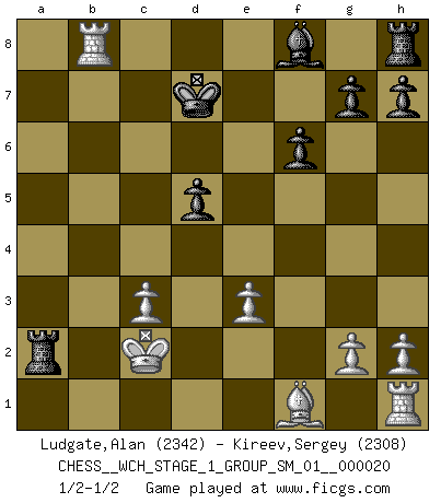 Last move : 1/2-1/2 2018 November 9 19:58:15 [Event "FICGS__CHESS__WCH_STAGE_1_GROUP_SM_01__000020"] [Site "FICGS"] [Date "2018.11.01"] [Round "1"] [White "Ludgate,Alan"] [Black "Kireev,Sergey"] [Result "1/2-1/2"] [WhiteElo "2342"] [BlackElo "2308"] 1.d4 d5 2.Bf4 Nf6 3.e3 c5 4.c3 Nc6 5.Nd2 Bf5 6.Ngf3 Qb6 7.dxc5 Qxb2 8.Nd4 Ne4 9.Qc1 Qxd2+ 10.Qxd2 Nxd2 11.Kxd2 Bd7 12.Rb1 e5 13.Nxc6 exf4 14.Ne5 fxe3+ 15.fxe3 b6 16.cxb6 axb6 17.Rxb6 Rxa2+ 18.Kc1 f6 19.Rb8+ Ke7 20.Nxd7 Kxd7 21.Kb1 Ra3 22.Kc2 Ra2+ 1/2-1/2 Queen's pawn, Mason variation This chess game ended in a draw. Follow this game move after move (download)Bobby Fischer is the greatest Chess genius of all time ! (Alexander Kotov) Es ist besser die Steine des Gegners zu opfern. (Savielly Grigorievitsch Tartakower) Debes de llevar a tu oponente hacia un profundo y obscuro bosque donde 2+2=5, y el camino que conduce a la salida es suficientemente ancho para solamente uno. (Mikhail Tal) Les Echecs représentent une sphère d'idées créatrices basée sur la volonté des deux protagonistes. (Smyslov) There is a very easy way to return from a casino with a small fortune : go there with a large one. (Jack Yelton)