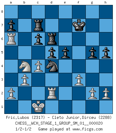 Last move : 1/2-1/2 2019 January 14 8:6:36 [Event "FICGS__CHESS__WCH_STAGE_1_GROUP_SM_01__000020"] [Site "FICGS"] [Date "2018.11.01"] [Round "1"] [White "Fric,Lubos"] [Black "Cleto Junior,Dirceu"] [Result "1/2-1/2"] [WhiteElo "2317"] [BlackElo "2288"] 1.e4 c5 2.Nf3 d6 3.d4 cxd4 4.Nxd4 Nf6 5.Nc3 g6 6.Be3 Bg7 7.f3 O-O 8.Qd2 Nc6 9.O-O-O d5 10.exd5 Nxd5 11.Nxc6 bxc6 12.Bd4 Bxd4 13.Qxd4 Qb6 14.Na4 Qa5 15.b3 Be6 16.Qe5 Qb4 17.Kb2 Rad8 18.Rd4 Qd6 19.Qxd6 exd6 20.Bc4 Ne3 21.Bxe6 fxe6 22.Re1 e5 23.Rd2 Nf5 24.Kc1 Rde8 25.c3 Re6 26.Nb2 Rf7 27.Nd3 Rfe7 28.Re4 d5 29.Ra4 h5 30.Nc5 Rd6 31.Ra6 Kf7 32.Nd3 g5 33.Nb4 Rc7 34.c4 Nd4 1/2-1/2 Sicilian : Dragon, Yugoslav attack, 7...O-O Kingside Castling by player Black (move 7) Queenside Castling by player White (move 9) This chess game ended in a draw. Follow this game move after move (download)The laws of Chess do not permit a free choice: you have to move whether you like it or not. (Emanuel Lasker) Die Fehler sind da, Sie warten nur darauf gemacht zu werden. (Savielly Grigorievitsch Tartakower) No puedes jugar al Ajedrez si eres de corazón noble. (Proverbio Francés) Je ne suis pas le dernier à jouer lâchement des coups douteux pendant le zeïtnot de l'adversaire pour l'achever: en effet les coups qui font le plus peur sont ceux que l'on ne comprend pas. Je me fais souvent peur quand je joue. (Un professeur anonyme) Chess, like love, like music, has the power to make people happy. (Siegbert Tarrasch)