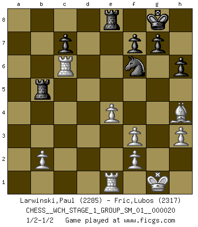 Last move : 1/2-1/2 2018 November 27 20:54:52 [Event "FICGS__CHESS__WCH_STAGE_1_GROUP_SM_01__000020"] [Site "FICGS"] [Date "2018.11.01"] [Round "1"] [White "Larwinski,Paul"] [Black "Fric,Lubos"] [Result "1/2-1/2"] [WhiteElo "2285"] [BlackElo "2317"] 1.e4 e5 2.Nf3 Nc6 3.Bb5 Nf6 4.d3 Bc5 5.c3 O-O 6.O-O d6 7.Nbd2 Bd7 8.Nc4 a6 9.Bxc6 bxc6 10.Re1 Be6 11.d4 exd4 12.cxd4 Bb4 13.Bd2 a5 14.a3 Bxc4 15.axb4 axb4 16.Rc1 Be6 17.Qc2 c5 18.dxc5 b3 19.Qb1 Bg4 20.Bg5 h6 21.Bh4 Ra4 22.Qd3 Re8 23.h3 Bxf3 24.gxf3 dxc5 25.Qxb3 Rb4 26.Qc3 Qd7 27.Qxc5 Rb5 28.Qc6 Qxc6 29.Rxc6 1/2-1/2 Ruy Lopez : Berlin defense Kingside Castling by player Black (move 5) Kingside Castling by player White (move 6) This chess game ended in a draw. Follow this game move after move (download)I know people who have all the will in the world, but still can't play good Chess. (Bobby Fischer) In Buenos Aires ist es nicht mein vorrangiges Ziel ein starkes Turnier zu organisieren, sondern ein Turnier für Gentlemen. Ich würde nie Kamsky einladen. Ich mag keine Probleme. (Miguel Najdorf) Las piezas de Ajedrez son los bloques del alfabeto que moldean los pensamientos; y esos pensamientos, aunque hagan un diseño visual en el tablero, expresan abstractamente su belleza como un poema. (Marcel Duchamp) Les échecs sont un jeu terrible. Si vous n'avez pas le centre, votre adversaire a une position plus libre. Par contre, si vous avez le centre, alors vous avez vraiment quelque chose pour laquelle vous inquiéter ! (Siegbert Tarrasch) The man who strikes first admits that his ideas have given out. (Chinese proverb)
