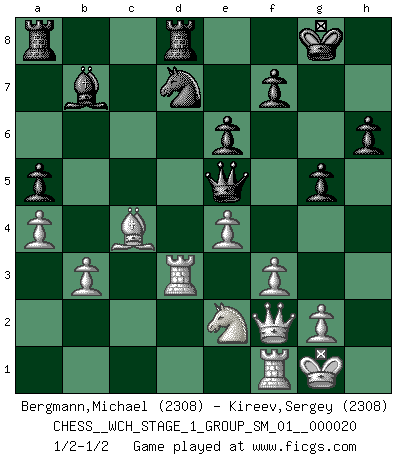 Last move : 1/2-1/2 2018 November 5 13:30:20 [Event "FICGS__CHESS__WCH_STAGE_1_GROUP_SM_01__000020"] [Site "FICGS"] [Date "2018.11.01"] [Round "1"] [White "Bergmann,Michael"] [Black "Kireev,Sergey"] [Result "1/2-1/2"] [WhiteElo "2308"] [BlackElo "2308"] 1.d4 d5 2.c4 c6 3.Nf3 Nf6 4.Nc3 e6 5.Bg5 h6 6.Bh4 dxc4 7.e4 g5 8.Bg3 b5 9.Be2 Bb7 10.O-O Nbd7 11.Ne5 Bg7 12.Nxd7 Nxd7 13.Bd6 a6 14.a4 b4 15.Bxb4 Qb6 16.Ba3 Qxd4 17.Qc2 c5 18.Rad1 Qe5 19.Bxc4 Qc7 20.Ne2 Be5 21.Kh1 O-O 22.b3 Nf6 23.Bd3 Rfd8 24.f3 Bxh2 25.Qxc5 Nd7 26.Qf2 Bd6 27.Bxd6 Qxd6 28.Bc4 Qe5 29.Kg1 a5 30.Rd3 1/2-1/2 QGD Slav : 4.Nc3 Kingside Castling by player White (move 10) Kingside Castling by player Black (move 21) This chess game ended in a draw. Follow this game move after move (download)My opponents make good moves too. Sometimes I don't take these things into consideration. (Bobby Fischer) In der Schule lernt man nichts. Es ist nur Zeitverschwendung. (Robert James Fischer) Algunos sacrificios son sólidos, los demás son míos. (Mikhail Tal) Tous ces prétendus hommes politiques sont les pions, les Cavaliers, les Tours ou les Fous d'une partie d'échecs qui se jouera tant qu'un hasard ne renversera pas l'échiquier. (Honoré de Balzac) It is not titles that honor men, but men that honor titles. (Niccolo Machiavelli)