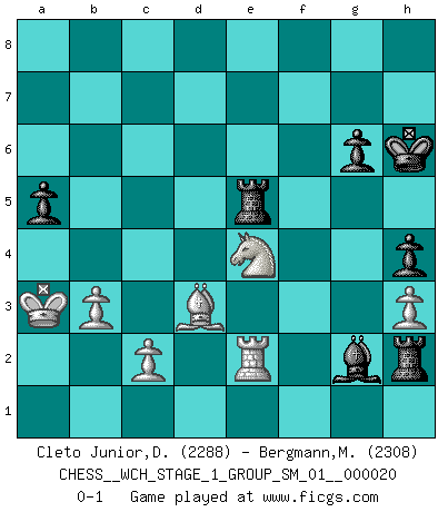 Last move : 0-1 2019 March 14 0:10:4 [Event "FICGS__CHESS__WCH_STAGE_1_GROUP_SM_01__000020"] [Site "FICGS"] [Date "2018.11.01"] [Round "1"] [White "Cleto Junior,Dirceu"] [Black "Bergmann,Michael"] [Result "0-1"] [WhiteElo "2288"] [BlackElo "2308"] 1.e4 c5 2.Nf3 d6 3.d4 cxd4 4.Nxd4 Nf6 5.Nc3 a6 6.Bg5 e6 7.Qf3 Nbd7 8.O-O-O Qc7 9.g4 b5 10.Bxf6 Nxf6 11.g5 Nd7 12.a3 Rb8 13.Qh3 g6 14.f4 Bg7 15.f5 b4 16.axb4 Rxb4 17.f6 Nxf6 18.gxf6 Bxf6 19.Nb3 O-O 20.Qe3 Bb7 21.Qd2 Rxe4 22.Rg1 Rb4 23.Rg3 a5 24.Qxd6 Qxd6 25.Rxd6 Be5 26.R6d3 Bf4+ 27.Rde3 Ra8 28.Nc5 Bh1 29.b3 Rc8 30.N5a4 h5 31.Rh3 Bxe3+ 32.Rxe3 Rf4 33.Re1 Bb7 34.Kb2 Rf2 35.h3 Rh2 36.Re3 Kg7 37.Bd3 Bc6 38.Nc5 Bg2 39.Nxe6+ fxe6 40.Rxe6 Rc5 41.Re7+ Kh6 42.Re2 Rg5 43.Ne4 Re5 44.Ka3 h4 0-1 Sicilian : Najdorf, 6...e6 Queenside Castling by player White (move 8) Kingside Castling by player Black (move 19) Player Black won this chess game. Follow this game move after move (download)A passed Pawn increases in strength as the number of pieces on the board diminishes. (Capablanca) Herr Iljumschinow ist ein etwas merkwürdiger Geschäftsmann: Er arbeitet zusammen mit Leuten wie Muammar al-Gaddafi; früher ist das Saddam Hussein gewesen. (Joel Lautier) El Jaque al descubierto es el bombardero del tablero. (Reuben Fine) Aidez vos pièces, elles vous aideront. (Paul Morphy) If you work for a living, why do you kill yourself working ? (Tuco to a chicken in The Good, The Bad and The Ugly)