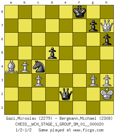 Last move : 1/2-1/2 2019 March 17 16:23:52 [Event "FICGS__CHESS__WCH_STAGE_1_GROUP_SM_01__000020"] [Site "FICGS"] [Date "2018.11.01"] [Round "1"] [White "Gazi,Miroslav"] [Black "Bergmann,Michael"] [Result "1/2-1/2"] [WhiteElo "2279"] [BlackElo "2308"] 1.d4 Nf6 2.Bg5 d5 3.Nd2 c5 4.e3 cxd4 5.exd4 Nc6 6.c3 h6 7.Bf4 Bf5 8.Qb3 Qc8 9.h3 a6 10.Ngf3 e6 11.a4 Be7 12.Be2 O-O 13.O-O Bd8 14.Rfe1 Bc7 15.Bxc7 Qxc7 16.Qa2 Rfd8 17.Bf1 b6 18.Qb3 Ne8 19.Rec1 Nd6 20.Qd1 Rdc8 21.Qe1 Bh7 22.Ne5 Nxe5 23.Qxe5 a5 24.Nf3 Qd8 25.Qf4 Be4 26.Re1 Bxf3 27.Qxf3 Nc4 28.Qe2 b5 29.axb5 a4 30.Ra2 Qb6 31.Rea1 Qxb5 32.b4 Qe8 33.g3 Rc7 34.Qe1 Nb6 35.Bd3 Rac8 36.Rc1 f6 37.Re2 Re7 38.f4 Nc4 39.Ra1 e5 40.dxe5 fxe5 41.Bc2 Ra8 42.Qd1 Nb6 43.Rxe5 Rxe5 44.fxe5 Qxe5 45.Qd3 Nc4 46.Kh2 Rf8 47.Qh7+ Kf7 48.Rf1+ Ke7 49.Rxf8 Kxf8 50.Bxa4 Qe2+ 1/2-1/2 Trompowsky attack (Ruth, Opovcensky Opening) Kingside Castling by player Black (move 12) Kingside Castling by player White (move 13) This chess game ended in a draw. Follow this game move after move (download)Weak points or holes in the opponent's position must be occupied by pieces not Pawns. (Siegbert Tarrasch) Zum Sieg gelangt man nicht, wenn man gut, sondern nur wenn man besser spielt (Savielly Grigorievitsch Tartakower) Aquel que ve no otra dirección en el juego que la de dar Jaque Mate a su oponente, nunca será un buen jugador de Ajedrez. (Euwe) Le thème de l'attaque double intervient d'une manière ou d'une autre dans l'immense majorité des combinaisons. (Youri Averbakh) Those parts of the system that you can hit with a hammer (not advised) are called hardware; those program instructions that you can only curse at are called software. (Anonymous)