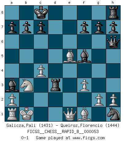 Last move : 0-1 2007 July 31 13:58:10 [Event "FICGS__CHESS__RAPID_B__000053"] [Site "FICGS"] [Date "2007.05.23"] [Round "1"] [White "Galicza,Pali"] [Black "Queiroz,Florencio"] [Result "0-1"] [WhiteElo "1431"] [BlackElo "1444"] 1.b3 e5 2.Bb2 Nc6 3.e4 Nf6 4.Nf3 Nxe4 5.Nxe5 Nxe5 6.Qe2 d5 7.d3 Bg4 8.f3 Qh4+ 9.Kd1 Nf2+ 10.Kc1 Be6 11.Bxe5 Qh6+ 12.Nd2 Ba3+ 13.Kb1 Nxh1 14.c4 dxc4 15.bxc4 O-O-O 16.Nb3 Bf5 17.Qe1 Rxd3 0-1 Nimzovich-Larsen attack : Modern variation Queenside Castling by player Black (move 15) Player Black won this chess game. Follow this game move after move (download)Bobby is the finest Chess player this country ever produced. His memory for the moves, his brilliance in dreaming up combinations, and his fierce determination to win are uncanny. (John Collins) Schach sollte überall auf der Welt Schulfach werden. Es fördert die geistige Auseinandersetzung. Es lehrt die Demut in der Niederlage. (Garry Kasparov) El Ajedrez es parte de la cultura, y si una cultura esta en decadencia, entonces también el Ajedrez declinará. (Mikhail Botvinnik) Les Echecs mettent en conflit, non pas deux intelligences, mais deux volontés. (Lasker) Cactus - It is depressed cucumber. (Ilmars Cirulis)