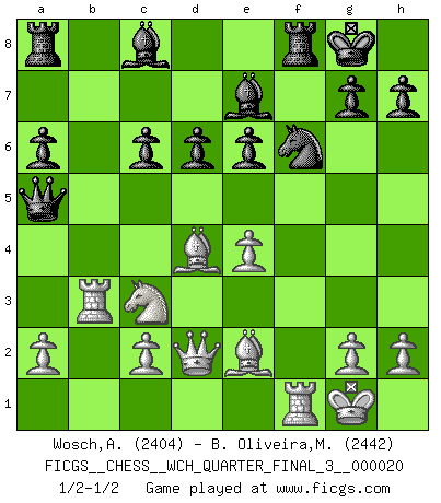 Last move : 1/2-1/2 2019 January 26 12:42:30 [Event "FICGS__CHESS__WCH_QUARTER_FINAL_3__000020"] [Site "FICGS"] [Date "2018.11.01"] [Round "8"] [White "Wosch,Arkadiusz"] [Black "B. Oliveira,Marcio"] [Result "1/2-1/2"] [WhiteElo "2404"] [BlackElo "2442"] 1.e4 c5 2.Nf3 d6 3.d4 cxd4 4.Nxd4 Nf6 5.Nc3 a6 6.Bg5 e6 7.f4 Qb6 8.Qd2 Qxb2 9.Rb1 Qa3 10.f5 Nc6 11.fxe6 fxe6 12.Nxc6 bxc6 13.Be2 Be7 14.O-O O-O 15.Rb3 Qc5+ 16.Be3 Qe5 17.Bd4 Qa5 18.Bb6 Qe5 19.Bd4 Qa5 1/2-1/2 Sicilian : Najdorf, 7...Qb6 Kingside Castling by player White (move 14) Kingside Castling by player Black (move 14) This chess game ended in a draw. Follow this game move after move (download)I had a toothache during the first game. In the second game I had a headache. In the third game it was an attack of rheumatism. In the fourth game, I wasn't feeling well. And in the fifth game? Well, must one have to win every game ? (Siegbert Tarrasch) Drei Punkte vor allen anderen ist wie einer, der im weißen Anzug posiert, während der Rest in Müllsäcke gekleidet dasteht. (Viktor Kortschnoi) Todo lo que importa ante el tablero de Ajedrez son buenas jugadas. (Bobby Fischer) Le plus grand jeu de l'esprit jamais inventé, plus vous l'apprenez, plus vous y prenez du plaisir. (Garry Kasparov) Rules and bones are meant to be broken. (Anonymous)