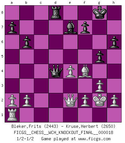 Last move : 1/2-1/2 2019 January 1 14:37:30 [Event "FICGS__CHESS__WCH_KNOCKOUT_FINAL__000018"] [Site "FICGS"] [Date "2018.11.01"] [Round "4"] [White "Bleker,Frits"] [Black "Kruse,Herbert"] [Result "1/2-1/2"] [WhiteElo "2443"] [BlackElo "2650"] 1.d4 Nf6 2.c4 e6 3.Nf3 b6 4.g3 Ba6 5.Qc2 c5 6.d5 exd5 7.cxd5 Bb7 8.Bg2 Nxd5 9.O-O Nc6 10.Rd1 Be7 11.Qa4 Nf6 12.Nh4 O-O 13.Nf5 d5 14.Nc3 Nd4 15.Nxd4 cxd4 16.Rxd4 Bc5 17.Rd1 Qc8 18.Nxd5 Nxd5 19.Bxd5 Bxd5 20.Rxd5 Qe6 21.Qd1 Qf6 22.e3 Rad8 23.Kg2 Rxd5 24.Qxd5 Rd8 25.Qf3 Be7 26.Qe2 h6 27.e4 Qd4 28.Bf4 g5 29.Bc7 Rc8 30.Bf4 Rd8 31.Bc7 Rc8 32.Bf4 Rd8 1/2-1/2 Queen's Indian : Nimzovich variation (exaggerated Fianchetto) Kingside Castling by player White (move 9) Kingside Castling by player Black (move 12) This chess game ended in a draw. Follow this game move after move (download)Without error there can be no brilliancy. (Emanuel Lasker) Der Verteidiger gebe der Gewalt nach, aber nur der Gewalt. Er schaffe sich nicht freiwillig, etwa aus Blindheit oder aus Schrecken, irgendwelche Schwächen. Er lasse sich nicht bluffen. (Emanuel Lasker) El jugador blanco perdió porque fallo en recordar la coreccta continuación y tuvo que pensar por sí mismo las movidas. (Siegbert Tarrasch) Il n'y a pas eu de défaite parce que je ne crois pas que cet ordinateur ait jamais existé. IBM a triché en refusant d'imprimer les modes de recherche de la machine. C'est évident, pendant le match, des coups décisifs ont été joués par des êtres humains. Aujourd'hui, les meilleurs spécialistes en informatique ne peuvent toujours pas expliquer comment Deep-Blue a pu jouer contre la logique des ordinateurs. IBM a gagné une guerre de communication, mais ils sont incapables de prouver que l'ordinateur a gagné tout seul. (Garry Kasparov) At last I discovered the true beauty of chess. So I proposed to her. (Dinesh De Silva)