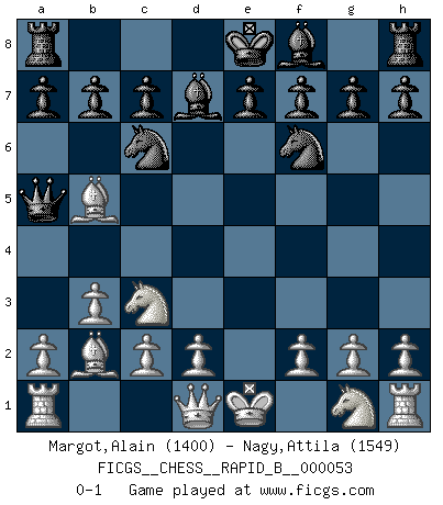 Last move : 0-1 2007 August 12 3:19:15 [Event "FICGS__CHESS__RAPID_B__000053"] [Site "FICGS"] [Date "2007.05.23"] [Round "1"] [White "Margot,Alain"] [Black "Nagy,Attila"] [Result "0-1"] [WhiteElo "1400"] [BlackElo "1549"] 1.e4 d5 2.exd5 Qxd5 3.Nc3 Qa5 4.b3 Nf6 5.Bb2 Nc6 6.Bb5 Bd7 0-1 This chess game has been lost on time (started : 2007.05.23 22:9:31) Scandinavian (centre counter) defense Player Black won this chess game. Follow this game move after move (download)In the perfect Chess combination as in a first-rate short story, the whole plot and counter-plot should lead up to a striking finale, the interest not being allayed until the very last moment. (Yates and Winter) Die FIDE ist dabei in die Hände der russischen Mafia zu fallen. (Larry Evans) Los asuntos humanos son como una partida de Ajedrez: solo aquellos que no lo toman seriamente, pueden ser llamados buenos jugadores. (Hung Tzu Ch'eng) Les ravages du H expliquent la différence de niveau entre Tal et Thal [Abergel]. When I took office, only high energy physicists had ever heard of what is called the World Wide Web... Now even my cat has its own page. (Bill Clinton, 1996)