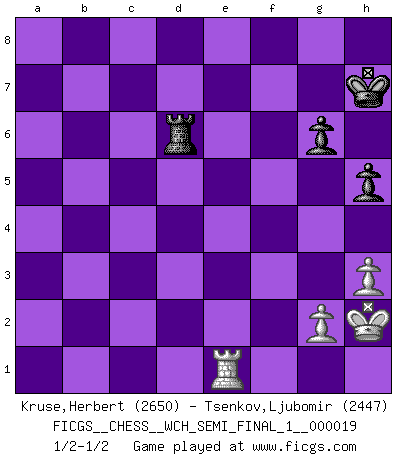 Last move : 1/2-1/2 2019 March 24 20:6:32 [Event "FICGS__CHESS__WCH_SEMI_FINAL_1__000019"] [Site "FICGS"] [Date "2018.11.01"] [Round "7"] [White "Kruse,Herbert"] [Black "Tsenkov,Ljubomir"] [Result "1/2-1/2"] [WhiteElo "2650"] [BlackElo "2447"] 1.e4 c5 2.Nc3 Nc6 3.Nge2 Nf6 4.d4 cxd4 5.Nxd4 e5 6.Ndb5 d6 7.Nd5 Nxd5 8.exd5 Nb8 9.a4 Be7 10.Be2 O-O 11.O-O Nd7 12.Kh1 a6 13.Na3 f5 14.f4 Qc7 15.Nc4 b6 16.Ra3 Rb8 17.Rc3 Qd8 18.b4 Bb7 19.Rg3 g6 20.Re3 Ba8 21.h3 b5 22.Na5 Qb6 23.c4 bxc4 24.Nxc4 Qxb4 25.Ba3 Qb7 26.Nxd6 Qc7 27.fxe5 Nxe5 28.Rxe5 Bxd6 29.Bxd6 Qxd6 30.Qd4 Rb4 31.Qc3 Rxa4 32.Bf3 Rc4 33.Qa1 Ra4 34.Qc3 Rc4 35.Qe3 Re4 36.Rxe4 fxe4 37.Qxe4 Bb7 38.Rc1 h5 39.Qe3 Kh7 40.Qa7 Rf7 41.Qd4 a5 42.Re1 Qb4 43.Qe5 Rf5 44.Qe7+ Kh6 45.Qe3+ Qf4 46.Qd3 a4 47.Qd1 a3 48.Qa1 Bxd5 49.Qh8+ Kg5 50.Qd8+ Kh6 51.Qh8+ Kg5 52.Qd8+ Kh6 53.Bxd5 Qd4 54.Qg8 Rxd5 55.Qf8+ Qg7 56.Qxa3 Qd4 57.Qf8+ Qg7 58.Qf4+ Kh7 59.Kh2 Qd7 60.Qf6 Qd6+ 61.Qxd6 Rxd6 1/2-1/2 Sicilian : chameleon variation Kingside Castling by player Black (move 10) Kingside Castling by player White (move 11) 10 pieces endgame at move 56 : White KQRPP , Black KQRPP WHITE : King + 1 Queen 1 Rook 2 Pawns BLACK : King + 1 Queen 1 Rook 2 Pawns 9 pieces endgame at move 61 : White KQRPP , Black KRPP WHITE : King + 1 Queen 1 Rook 2 Pawns BLACK : King + 1 Rook 2 Pawns 8 pieces endgame at move 61 : White KRPP , Black KRPP WHITE : King + 1 Rook 2 Pawns BLACK : King + 1 Rook 2 Pawns This chess game ended in a draw. Follow this game move after move (download)Life is a kind of Chess, with struggle, competition, good and ill events. (Benjamin Franklin) Ein unbeabsichtigtes Patt ist der Gipfel der Dummheit. (Anonymous) Una buena ofensiva y una buena defensa, comienzan ambas con un buen desarrollo. (Bruce A. Moon) Les Echecs, c'est l'art de la guerre sans les charniers, c'est la résurrection des morts tombés au champ d'honneur, l'espoir perpétuel, la suprématie de l'intelligence sur la force, la culture de l'esprit. (F. Szpiner) A good player is always lucky. (Capablanca)