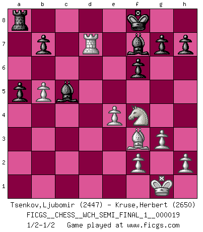 Last move : 1/2-1/2 2019 February 15 22:34:43 [Event "FICGS__CHESS__WCH_SEMI_FINAL_1__000019"] [Site "FICGS"] [Date "2018.11.01"] [Round "8"] [White "Tsenkov,Ljubomir"] [Black "Kruse,Herbert"] [Result "1/2-1/2"] [WhiteElo "2447"] [BlackElo "2650"] 1.c4 e5 2.g3 Nf6 3.Bg2 d5 4.cxd5 Nxd5 5.Nc3 Nb6 6.Nf3 Nc6 7.O-O Be7 8.a3 O-O 9.b4 Be6 10.Rb1 f6 11.b5 Nd4 12.e3 Nxf3+ 13.Bxf3 Qc8 14.Qc2 Rd8 15.Rd1 Bf5 16.d3 Kh8 17.e4 Bd7 18.a4 c6 19.Be3 cxb5 20.axb5 Be6 21.d4 Nc4 22.Qe2 Nxe3 23.Qxe3 Rxd4 24.Rxd4 exd4 25.Qxd4 Qc5 26.Qxc5 Bxc5 27.Rd1 Kg8 28.Nd5 Bf7 29.Nf4 Kf8 30.Rd7 a5 31.Rc7 Bd4 32.Rd7 Bc5 33.Rc7 Bd4 34.Rd7 Bc5 1/2-1/2 English Opening Kingside Castling by player White (move 7) Kingside Castling by player Black (move 8) This chess game ended in a draw. Follow this game move after move (download)Fischer was a master of clarity and a king of artful positioning. His opponents would see where he was going but were powerless to stop him. (Bruce Pandolfini) Jeder Fehler erscheint unglaublich dumm, wenn andre ihn begehen. (Georg Christoph Lichtenberg) Tu eres para mi la Reina en d8 y yo soy el Peón en d7!!. (GM Eduard Gufeld) Vous savez, camarade Pachman, je n'éprouve pas de plaisir à être ministre, je jouerais plutôt aux échecs comme vous, ou alors ferais une révolution au Venezuela. (Che Guevara à Ludek Pachman, 'Checkmate in Prague', 1975) I think your argument is specious - I think your tie is ugly. (Gregory House to Dr. Foreman, House M.D.)