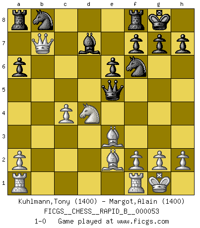 Last move : 1-0 2007 July 16 17:14:15 [Event "FICGS__CHESS__RAPID_B__000053"] [Site "FICGS"] [Date "2007.05.23"] [Round "1"] [White "Kuhlmann,Tony"] [Black "Margot,Alain"] [Result "1-0"] [WhiteElo "1400"] [BlackElo "1400"] 1.d4 d5 2.c4 c5 3.cxd5 Qxd5 4.Nf3 e6 5.Nc3 Qd8 6.e4 cxd4 7.Nxd4 a6 8.Be3 Bd7 9.Be2 Bb4 10.e5 Qa5 11.O-O Bxc3 12.bxc3 Qxe5 13.c4 Nf6 14.Qb3 O-O 15.Qxb7 1-0 This chess game has been lost on time (started : 2007.05.23 22:9:31) QGD : Symmetrical (Austrian) defense Kingside Castling by player White (move 11) Kingside Castling by player Black (move 14) Player White won this chess game. Follow this game move after move (download)Fischer wanted to give the Russians a taste of their own medicine. (Larry Evans) Ich las kürzlich ein Buch von Nietzsche. Er sagte Religion verdumme nur die Menschen. Ich stimme zu. (Robert James Fischer) Cuando le juegas a Fischer, no es una cuestion de si vas a ganar o perder. Es una cuestion de si vas a sobrevivir. (Boris Spassky) Tous ces prétendus hommes politiques sont les pions, les Cavaliers, les Tours ou les Fous d'une partie d'échecs qui se jouera tant qu'un hasard ne renversera pas l'échiquier. (Honoré de Balzac) Luck is the residue of design. (John Milton)