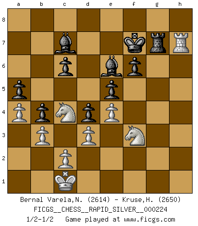 Last move : 1/2-1/2 2019 April 4 17:27:33 [Event "FICGS__CHESS__RAPID_SILVER__000224"] [Site "FICGS"] [Date "2018.11.01"] [Round "2"] [White "Bernal Varela,Nelson"] [Black "Kruse,Herbert"] [Result "1/2-1/2"] [WhiteElo "2614"] [BlackElo "2650"] 1.e4 e5 2.Nf3 Nc6 3.Bb5 Nf6 4.d3 Bc5 5.Bxc6 dxc6 6.Nbd2 O-O 7.Nc4 Re8 8.a4 Nd7 9.Be3 f6 10.O-O Bf8 11.Re1 Nb8 12.Nfd2 Be6 13.Qe2 Bf7 14.Kh1 Nd7 15.Nb3 b6 16.h3 a6 17.Qf1 c5 18.Nbd2 Be7 19.f3 c6 20.Nb3 a5 21.Nc1 b5 22.Nd2 Nf8 23.Ne2 Ne6 24.Ng3 Bg6 25.Qf2 Nd4 26.Rec1 Bd6 27.Ndf1 Bc7 28.Nd2 Qd6 29.Qg1 Red8 30.Qe1 Bf7 31.Bg1 Rab8 32.b3 h6 33.Ngf1 Qd7 34.Ne3 Be6 35.Bf2 Kh7 36.Qd1 b4 37.Rab1 Qe7 38.Qe1 Rg8 39.Nec4 Bf7 40.Bxd4 cxd4 41.Kg1 Be6 42.Qf2 h5 43.Kf1 g5 44.g4 Rh8 45.Ke1 Kg7 46.Ke2 Rh7 47.Rh1 Rbh8 48.Qg3 Rh6 49.Rbf1 R8h7 50.Kd1 Rh8 51.Kc1 Kf7 52.Qg2 Ke8 53.h4 gxh4 54.Rxh4 Qg7 55.Qf2 hxg4 56.Rxh6 Rxh6 57.Rg1 Rg6 58.fxg4 Rxg4 59.Rh1 Rg2 60.Qh4 Rg4 61.Qh5+ Ke7 62.Nf3 Qf7 63.Qxf7+ Kxf7 64.Rh7+ Rg7 65.Rh8 Rg8 66.Rh7+ Rg7 67.Rh8 Rg8 68.Rh7+ Rg7 1/2-1/2 Ruy Lopez : Berlin defense Kingside Castling by player Black (move 6) Kingside Castling by player White (move 10) This chess game ended in a draw. Follow this game move after move (download)A chess genius has died; a loss for humanity. (Viktor Kortchnoi, about Bobby Fischer's death) Ich bin der einzige Schachspieler, der sich während der Vorbereitungen zum Turnier verletzt hat. (Woody Allen) Sin errores no puede haber brillantez. (Emanuel Lasker) Pour se monter efficace, un Cavalier a besoin d'avant-postes ! Les Cavaliers font les meilleurs bloqueurs de pions passés. Lottery : A tax on people who are bad at math. (Author unknown)