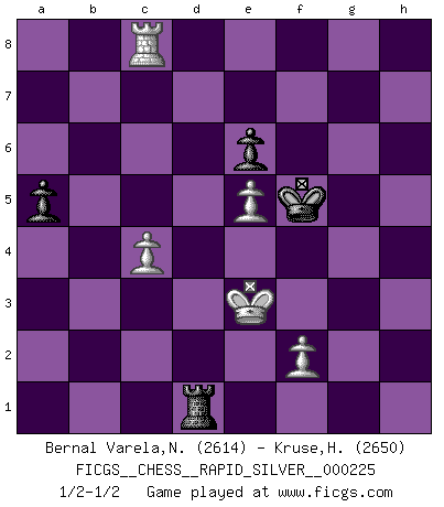 Last move : 1/2-1/2 2019 January 13 22:52:37 [Event "FICGS__CHESS__RAPID_SILVER__000225"] [Site "FICGS"] [Date "2018.11.01"] [Round "2"] [White "Bernal Varela,Nelson"] [Black "Kruse,Herbert"] [Result "1/2-1/2"] [WhiteElo "2614"] [BlackElo "2650"] 1.e4 e5 2.Nf3 Nc6 3.Bc4 Nf6 4.d3 Bc5 5.O-O d6 6.c3 O-O 7.Re1 h6 8.a4 a5 9.h3 Be6 10.Bxe6 fxe6 11.Be3 Bxe3 12.Rxe3 d5 13.Nbd2 d4 14.Re1 Nh5 15.g3 dxc3 16.bxc3 Qxd3 17.Re3 Qd7 18.Qb3 Nf6 19.Kg2 b6 20.Nc4 Qe8 21.Nfxe5 Nxe5 22.Nxe5 Nd7 23.Nd3 Rb8 24.Ra2 Kh7 25.e5 Nc5 26.Nxc5 bxc5 27.Qc2+ Qg6 28.Qe4 h5 29.Rae2 Rb1 30.Qxg6+ Kxg6 31.Rd3 Ra1 32.Re4 Ra2 33.Rf3 Rf5 34.g4 Rxf3 35.Kxf3 Rd2 36.Ke3 Rd1 37.gxh5+ Kxh5 38.Rf4 g5 39.Rf7 Ra1 40.Rxc7 Rxa4 41.Rxc5 g4 42.hxg4+ Kxg4 43.c4 Ra1 44.Kd4 Kf5 45.Rc8 Rd1+ 46.Ke3 1/2-1/2 Two knights defense (Modern Bishop's Opening) Kingside Castling by player White (move 5) Kingside Castling by player Black (move 6) 10 pieces endgame at move 42 : White KRPPPP , Black KRPP WHITE : King + 1 Rook 4 Pawns BLACK : King + 1 Rook 2 Pawns 9 pieces endgame at move 42 : White KRPPP , Black KRPP WHITE : King + 1 Rook 3 Pawns BLACK : King + 1 Rook 2 Pawns This chess game ended in a draw. Follow this game move after move (download)Alekhine is a poet who creates a work of art out of something that would hardly inspire another man to send home a picture post card. (Max Euwe) Ich glaube, ich kenne inzwischen die Gründe für mein Versagen: schachliche Charakterfehler. Ich war nie ein Wunderkind und in meiner gesamten menschlichen Entwicklung immer zu langsam. (Viktor Kortschnoi) Si no le temes a Spassky, entonces elimino el elemento del dinero. (Jim Slater) La tactique est l'élément le plus important du milieu de jeu. (Siegbert Tarrasch) He who is a good ruler must first have been ruled. (Aristotle)