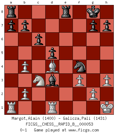Last move : 0-1 2007 July 28 13:10:12 [Event "FICGS__CHESS__RAPID_B__000053"] [Site "FICGS"] [Date "2007.05.23"] [Round "1"] [White "Margot,Alain"] [Black "Galicza,Pali"] [Result "0-1"] [WhiteElo "1400"] [BlackElo "1431"] 1.e4 e5 2.Bc4 Nf6 3.d4 Nxe4 4.Qh5 Qf6 5.Qxe5+ Qe7 6.Nf3 Nc6 7.Qxe7+ Bxe7 8.Bd3 d5 9.O-O O-O 10.h3 Nb4 11.Na3 Bf5 12.Nd2 Nxd3 13.cxd3 Nf6 14.Nf3 Bxd3 15.Re1 Ne4 16.Be3 c6 17.Ne5 Ba6 18.f3 Ng3 19.Bf2 Ne2+ 20.Kh1 Rfe8 21.Nb1 Bb4 22.Rd1 f6 23.a3 fxe5 24.axb4 exd4 25.Bxd4 Nf4 26.Nc3 Bd3 0-1 This chess game has been lost on time (started : 2007.05.23 22:9:31) Bishop's Opening : Ponziani gambit Kingside Castling by player White (move 9) Kingside Castling by player Black (move 9) Player Black won this chess game. Follow this game move after move (download)I am the best player in the world and I am here to prove it. (Bobby Fischer) Obendrein hat der FIDE-Präsident den Revolutionsführer Gaddafi zum »Großmeister« ernannt, am Ende der WM. Das ist lächerlich! (Joel Lautier) Tu no necesitas jugar muy bien, únicamente ayudar a tu oponenet a que juegue muy mal. (Genrikh Chepukaitis) On est toujours la mazette de quelqu'un d'autre. (Anonyme) Go and wake up your luck. (Persian saying)