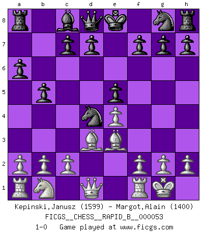 Last move : 1-0 2007 July 14 23:0:55 [Event "FICGS__CHESS__RAPID_B__000053"] [Site "FICGS"] [Date "2007.05.23"] [Round "1"] [White "Kepinski,Janusz"] [Black "Margot,Alain"] [Result "1-0"] [WhiteElo "1599"] [BlackElo "1400"] 1.e4 e5 2.Bc4 Bc5 3.d4 Bxd4 4.Nf3 Nc6 5.Nxd4 Nxd4 6.Be3 b5 7.Bd3 a6 8.O-O 1-0 This chess game has been lost on time (started : 2007.05.23 22:9:31) Bishop's Opening : Lewis gambit Kingside Castling by player White (move 8) Player White won this chess game. Follow this game move after move (download)Adequate compensation for a sacrifice is having a sound combination leading to a winning position; adequate compensation for a blunder is having your opponent snatch defeat from the jaws of victory. (Bruce A. Moon) Über die Verhaftung Bobby Fischers: Warum es die Bush-Administration für nötig befindet einen 61 Jahre alten Mann zu hetzten, der für niemanden ausser sich selbste eine Gefahr darstellt ist ein Rätsel. (Nigel Short) Los Peones son nacidos libres, y aún así, se encuentran por doquier encadenados. (Rick Kennedy) La tactique est l'élément le plus important du milieu de jeu. (Siegbert Tarrasch) Over-the-board chess is the favorite of mortals, correspondence chess is the favorite of the gods. (Eduard Dyckhoff)