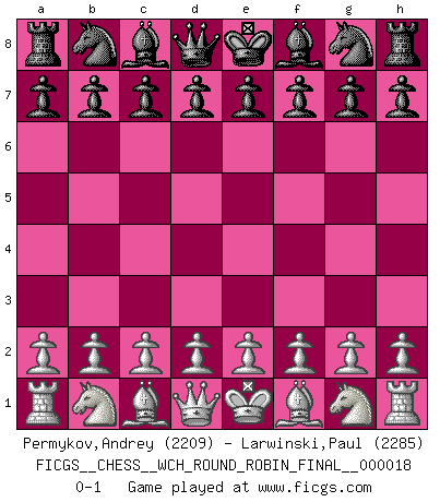 Last move : 0-1 2018 December 2 0:2:49 [Event "FICGS__CHESS__WCH_ROUND_ROBIN_FINAL__000018"] [Site "FICGS"] [Date "2018.11.01"] [Round "1"] [White "Permykov,Andrey"] [Black "Larwinski,Paul"] [Result "0-1"] [WhiteElo "2209"] [BlackElo "2285"] 0-1 This chess game has been lost on time (started : 2018.11.01 21:44:10) Player Black won this chess game. Follow this game move after move (download)I'm not a materialistic person, in that, I don't suffer the lack or loss of money. The absence of worldly goods I don't look back on. For Chess is a way I can be as materialistic as I want without having to sell my soul. (Jamie Walter Adams) Die Jungen erwarten, dass Opa einfach umfällt. Dann aber kann Opa fünf Stunden lang Schach spielen und die jungen Gegner an die Wand drücken. (Viktor Kortschnoi) Morphy probablemente fue el genio más grande de todos. (Bobby Fischer) Il vaut toujours mieux jouer un plan faux de façon logique que de n'avoir pas de plan du tout. (Victor Kortchnoï) The real danger is not that computers will begin to think like men, but that men will begin to think like computers. (Sydney J. Harris)