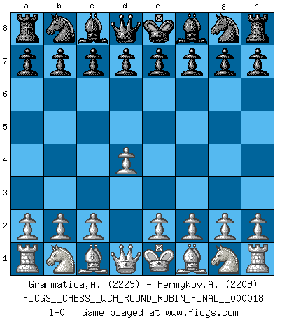 Last move : 1-0 2018 December 2 12:9:23 [Event "FICGS__CHESS__WCH_ROUND_ROBIN_FINAL__000018"] [Site "FICGS"] [Date "2018.11.01"] [Round "1"] [White "Grammatica,Andrea"] [Black "Permykov,Andrey"] [Result "1-0"] [WhiteElo "2229"] [BlackElo "2209"] 1.d4 1-0 This chess game has been lost on time (started : 2018.11.01 21:44:10) Queen's pawn Player White won this chess game. Follow this game move after move (download)Place the contents of the Chess box in a hat, shake them up vigorously, pour them on the board from a height of two feet, and you get the style of Steinitz. (H. E. Bird) Spiel ein langweiliges Spiel zu Ende und lustige Dinge können passieren. (Hans Ree) El Ajedrez, como cualquier actividad creativa, solo puede existir a través del esfuerzo combinado de aquellos que tienen talento creativo y de aquellos que poseen la habilidad de organizar su trabajo creativo. (Mikhail Botvinnik) On entre au jeu d'Echecs comme on entre en Religion. Pour le joueur d'Echecs, la partie d'Echecs c'est l'office, la messe, le défilé du 1er Mai, le dépôt de gerbe au Monument aux Morts. C'est un drame sacré. (Michel Roos) Memory... is the diary that we all carry with us. (Oscar Wilde, The Importance of Being Earnest)