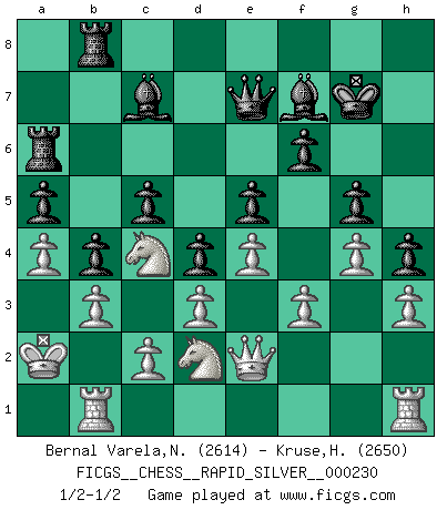 Last move : 1/2-1/2 2019 July 8 1:52:5 [Event "FICGS__CHESS__RAPID_SILVER__000230"] [Site "FICGS"] [Date "2018.11.01"] [Round "2"] [White "Bernal Varela,Nelson"] [Black "Kruse,Herbert"] [Result "1/2-1/2"] [WhiteElo "2614"] [BlackElo "2650"] 1.e4 e5 2.Nf3 Nc6 3.Bb5 Nf6 4.d3 Bc5 5.Bxc6 dxc6 6.Nbd2 O-O 7.Nc4 Re8 8.a4 Nd7 9.Be3 f6 10.O-O Bf8 11.Re1 Nb8 12.Nfd2 Be6 13.Qe2 Bf7 14.Kh1 Nd7 15.Nb3 a6 16.h3 b6 17.Qf1 c5 18.Nbd2 Be7 19.f3 c6 20.Nb3 a5 21.Nc1 b5 22.Nd2 Nf8 23.Ne2 Ne6 24.Ng3 Bg6 25.Qf2 Nd4 26.Rec1 Bd6 27.Ndf1 Bc7 28.Nd2 Qd6 29.Qg1 Red8 30.Qe1 Bf7 31.Bg1 Rab8 32.b3 h6 33.Ngf1 Qd7 34.Ne3 Be6 35.Bf2 Kh7 36.Qd1 b4 37.Rab1 Qe7 38.Qe1 Rg8 39.Nec4 Bf7 40.Bxd4 cxd4 41.Kg1 Be6 42.Qf2 h5 43.Kf1 g5 44.g4 Rh8 45.Ke1 Kg7 46.Ke2 Rh7 47.Rh1 Rbh8 48.Qg3 Kg8 49.Rbf1 Qc5 50.Qg2 h4 51.Kd1 Re7 52.Kc1 Kf7 53.Rd1 R7e8 54.Rhe1 Kg7 55.Kb2 Ra8 56.Ka2 Qe7 57.Qe2 Rhe8 58.Qg2 Kf8 59.Qe2 Kg7 60.Rf1 Rh8 61.Kb2 Rhf8 62.Rde1 Rfd8 63.Ra1 Rg8 64.Rab1 Rab8 65.Rfc1 Ra8 66.Rd1 Rgf8 67.Ka2 Kf7 68.Rbc1 Ra7 69.Ra1 Bb8 70.Rf1 Bc7 71.Rae1 R7a8 72.Rg1 Kg7 73.Rd1 Rfe8 74.Kb2 Kf7 75.Qg2 Kg6 76.Rh1 Rad8 77.Qe2 Ra8 78.Rb1 Qf7 79.Qe1 Qf8 80.Rh2 Ra6 81.Re2 Kf7 82.Rf2 Kg8 83.Ka2 R6a8 84.Re2 Rad8 85.Qf1 Qc5 86.Kb2 Kf7 87.Qg2 Qe7 88.R2e1 Qc5 89.Qe2 Rb8 90.Qf1 Red8 91.Rbc1 Kg7 92.Qg2 Kg6 93.Rb1 Qf8 94.Rbd1 c5 95.Rf1 Kh7 96.Qe2 Kg7 97.Qf2 Rbc8 98.Qe2 Qe7 99.Qf2 Kf8 100.Qe2 Kg7 101.Rb1 Ra8 102.Ra1 Re8 103.Rad1 Rad8 104.Ka2 Qf7 105.Kb2 Qg6 106.Ra1 Rg8 107.Ka2 Rge8 108.Kb2 Kf8 109.Ka2 Ra8 110.Rad1 Ra7 111.Rde1 Ra6 112.Kb2 Ke7 113.Rh1 Kf8 114.Ka2 Qf7 115.Rb1 Bd8 116.Rbc1 Qc7 117.Rb1 Qc6 118.Ra1 Bc7 119.Rhd1 Qd7 120.Rh1 Ke7 121.Rhf1 Rf8 122.Rg1 Rd8 123.Rgb1 Rda8 124.Re1 Kd8 125.Kb2 Kc8 126.Ka2 Rb8 127.Rf1 Kb7 128.Rab1 Bf7 129.Rfd1 Kc8 130.Rf1 Qe7 131.Rfe1 Kd7 132.Rh1 Ke8 133.Rhe1 Kf8 134.Rh1 Kg7 1/2-1/2 Ruy Lopez : Berlin defense Kingside Castling by player Black (move 6) Kingside Castling by player White (move 10) This chess game ended in a draw. Follow this game move after move (download)My opponents make good moves too. Sometimes I don't take these things into consideration. (Bobby Fischer) Schach verlangt totale Konzentration. (Robert James Fischer) No es suficiente ser un buen jugador, se debe también de jugar bién. (Siegbert Tarrasch) Je menace de comprendre la position. (Anonyme) A bird doesn't sing because it has an answer, it sings because it has a song. (Maya Angelou)