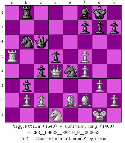 Last move : 0-1 2007 September 28 22:22:23 [Event "FICGS__CHESS__RAPID_B__000053"] [Site "FICGS"] [Date "2007.05.23"] [Round "1"] [White "Nagy,Attila"] [Black "Kuhlmann,Tony"] [Result "0-1"] [WhiteElo "1549"] [BlackElo "1400"] 1.e4 d6 2.d4 Nf6 3.Nc3 e5 4.Nf3 exd4 5.Nxd4 Be7 6.f3 O-O 7.Bc4 c5 8.Nf5 Bxf5 9.exf5 Nbd7 10.Be2 a6 11.O-O b5 12.a3 Qb6 13.Be3 Qc6 14.f4 d5 15.Bf3 Nb6 16.Qd3 c4 17.Qd4 Rab8 18.Rfe1 Rfd8 19.Rad1 a5 20.Bf2 Bf8 21.Re5 Bd6 22.g3 Qd7 23.Re2 Bf8 24.Red2 Qc6 25.Ra1 b4 26.axb4 axb4 27.Nd1 Re8 28.Re2 Rxe2 29.Bxe2 Ne4 30.Ra5 b3 0-1 This chess game has been lost on time (started : 2007.05.23 22:9:31) Pirc defense Kingside Castling by player Black (move 6) Kingside Castling by player White (move 11) Player Black won this chess game. Follow this game move after move (download)Checkers is for tramps. (Paul Morphy) Wie, soll nun auch die Opposition abgeschafft werden? Ja, es tut mir leid, Ihnen diesen Schmerz nicht ersparen zu können. (Aaron Nimzowitsch) Me siento como si fuera una pieza en una partida de Ajedrez, cuando mi oponente me indica: esa pieza no puede ser movida. (Soren Kierkegaard) Il s'avisa de me proposer d'apprendre les échecs qu'il jouait un peu... me voilà forcené des échecs. J'achète un échiquier, je m'enferme dans ma chambre, j'y passe des jours et des nuits à vouloir apprendre par cur toutes les parties. (Jean-Jacques Rousseau, Confessions) Whoever said the pen is mightier than the sword obviously never encountered automatic weapons. (US General Douglas MacArthur)