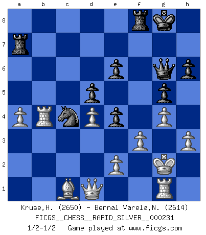 Last move : 1/2-1/2 2019 April 4 9:56:24 [Event "FICGS__CHESS__RAPID_SILVER__000231"] [Site "FICGS"] [Date "2018.11.02"] [Round "1"] [White "Kruse,Herbert"] [Black "Bernal Varela,Nelson"] [Result "1/2-1/2"] [WhiteElo "2650"] [BlackElo "2614"] 1.Nf3 e6 2.d4 f5 3.g3 Nf6 4.Bg2 Be7 5.O-O O-O 6.c4 Ne4 7.Qc2 d5 8.Nc3 c6 9.Bf4 g5 10.Be3 Nd6 11.b3 Nd7 12.Rad1 b6 13.Qc1 Nf7 14.b4 b5 15.cxb5 cxb5 16.Nxb5 Nb6 17.Ne5 Ba6 18.Nc6 Qd7 19.Nxe7+ Qxe7 20.Nc3 Bc8 21.Qb1 Bd7 22.Rd3 a6 23.Bc1 Rac8 24.b5 axb5 25.Nxb5 Bxb5 26.Qxb5 Nc4 27.Qb1 Nfd6 28.Rb3 Kg7 29.Rd1 Rc7 30.Bf3 Na5 31.Rb4 Nac4 32.a3 h6 33.Qb3 Ne4 34.Kg2 Nf6 35.Kg1 Ne4 36.Bxe4 fxe4 37.Rf1 Qf6 38.Qd1 Rcf7 39.Rb3 Kg8 40.Be3 Qg6 41.Kg2 Ra7 42.Bc1 Qf6 43.f3 Raf7 44.a4 Kg7 45.h3 Kg8 46.Rg1 Ra7 47.Rb4 Raf7 48.Rb3 Ra7 49.Rb4 Qg6 50.g4 Raf7 51.Rb3 Ra7 52.Rb4 Qf6 53.Rb5 Qg6 54.Rb4 1/2-1/2 Reti Opening Kingside Castling by player White (move 5) Kingside Castling by player Black (move 5) This chess game ended in a draw. Follow this game move after move (download)A passed Pawn increases in strength as the number of pieces on the board diminishes. (Capablanca) Dass jemand wie Surab Asmaiparaschwili, der selbst Elopunkte gekauft hat , Vize-Präsident der Fide werden konnte, sagt schon einges über den Zustand dieser Organisation aus. (Joel Lautier) Una de estas pequeñas movidas modestas pudieran ser mas molestas a tu oponente que la amenaza mas grande. (Siegbert Tarrasch) Aucun coup ne doit être joué sans but. (Pedro Damiano) All maxims have their antagonist maxims; proverbs should be sold in pairs, a single one being but a half truth. (William Mathews)