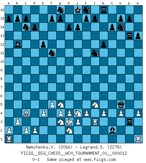 Last move : 0-1 2018 November 23 19:18:58 [Event "FICGS__BIG_CHESS__WCH_TOURNAMENT_01__000012"] [Site "FICGS"] [Date "2018.11.02"] [Round "1"] [White "Nemchenko,Valery"] [Black "Legrand,Stephane"] [Result "0-1"] [WhiteElo "2066"] [BlackElo "2278"] 1.j2-k4 p16-o14 2.g2-g4 b16-c14 3.f2-f4 e15-e13 4.g1-f3 m15-m13 5.k1-l3 j15-k13 6.b1-c3 h15-g13 7.b2-b3 l16-o13 8.e2-e4 n15-n14 9.c1-b2 f16-c13 10.n2-n3 d15-d14 11.f1-c4 c16-k9 12.m2-m4 q15-q13 13.f4-f5 h16-p9 14.p1-o3 k9-h7 15.o1-h7 o13-h7 16.q1-p1 q16-q14 17.l1-m2 q14-p14 18.j1-j2 e13-e12 19.f3-g5 h7-l4 20.k2-k3 l4-d11 21.h2-f3 g13-f11 22.c3-e2 e16-e13 23.l3-j4 o16-k12 24.l2-l4 k12-l11 25.b2-l11 k13-l11 26.h3-h4 m13-m12 27.k4-j6 e13-p13 28.e2-g3 p9-o9 29.m1-o1 p13-p2 30.p1-p2 p14-p2 31.h1-m1 a16-e16 32.q2-q4 e16-e13 33.m2-n1 c13-b12 34.k3-k4 e13-o13 35.o3-p5 o9-q9 36.o1-q1 p2-p5 37.o2-o4 q9-l4 38.j2-h3 p5-p2 39.e1-l1 l4-n2 40.f3-h2 n2-n3 41.l1-l3 n3-n4 42.n1-p3 o13-p13 43.j6-l5 n4-o5 44.m1-o3 p2-p3 45.o3-n2 d11-n2 0-1 Follow this game move after move (download)The most powerful weapon in Chess is to have the next move. (David Bronstein) Ja, ich habe einmal eine Blitzpartie gespielt, es war in einem Zug, 1929. --im Interview 1989 (Mikhail Moiseyevich Botvinik) Si el Ajedrez es una ciencia, es la mas inexacta. Si el Ajedrez es un arte, es demasiado inexacto para ser visto como tal. Si el Ajedrez es un deporte, es demasiado esotérico. Si el Ajedrez es un juego, es demasiado exigente para ser solo un juego. Si el Ajedrez es una aventura, es una muy demandante. Si el Ajedrez es una pasión, es una muy gratificante. Si el Ajedrez es la vida, es una muy triste. (Anónimo) Même si vous avez un bon coup à faire, regardez toujours s'il n'y en a pas un qui lui soit préférable. (Pedro Damiano) Statistics can be made to prove anything - even the truth. (Author unknown)