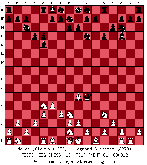 Last move : 0-1 2018 November 10 10:49:11 [Event "FICGS__BIG_CHESS__WCH_TOURNAMENT_01__000012"] [Site "FICGS"] [Date "2018.11.02"] [Round "1"] [White "Marcel,Alexis"] [Black "Legrand,Stephane"] [Result "0-1"] [WhiteElo "1222"] [BlackElo "2278"] 1.g2-g4 b16-c14 2.n2-n3 e15-e13 3.b2-b3 p16-o14 4.c1-b2 j15-k13 5.j2-h4 m15-m13 6.h2-j4 l16-o13 7.d2-d3 n15-n14 8.p1-o3 o16-d6 9.k1-h2 h16-l13 10.g1-f3 d15-d13 11.b2-e5 d6-e5 12.f3-e5 l13-l2 13.o3-m4 l2-l9 14.e2-e4 c16-k9 15.o1-j6 l9-p5 16.f2-f4 p5-p2 17.m1-o1 k9-j8 18.j4-k6 j8-e12 19.f4-f5 p2-p6 20.q1-p1 p6-k6 0-1 Follow this game move after move (download)Chess is a forcing house where the fruits of character can ripen more fully than in life. (Edward Morgan Foster) Über Kasparov: Es ist offensichtlich, daß er in einem totalitären Staat aufwuchs und deshalb zu diktatorischen Zügen neigt. (Viktor Kortschnoi) Diferente gente reacciona diferentemente en aceptar la derrota. (Bobby Fischer) Assurément je connaissais par expérience le mystérieux attrait de ce jeu royal, le seul entre tous les jeux inventés par les hommes qui échappe souverainement à la tyrannie du hasard, le seul où l'on ne doive sa victoire qu'à son intelligence ou plutôt à une certaine forme d'intelligence. Mais n'est-ce pas déjà le limiter injurieusement que d'appeler les échecs un jeu ? N'est-ce pas une science, un art ou quelque chose qui, comme le cercueil de Mahomet entre ciel et terre, est suspendu entre l'un et l'autre, et qui réunit un nombre incroyable de contraires ? [...] C'est une pensée qui ne mène à rien, une mathématique qui n'établit rien, un art qui ne laisse pas d'uvre, une architecture sans matière; et il l'a prouvé néanmoins qu'il était plus durable, à sa manière, que les livres ou que tout autre monument, ce jeu unique qui appartient à tous les peuples et à tous les temps, et dont personne ne sait quel dieu en fit don à la terre pour tuer l'ennui, pour aiguiser l'esprit et stimuler l'âme. Où commence-t-il, où finit-il ? (Stefan Zweig) The Internet isn't free. It just has an economy that makes no sense to capitalism. (Brad Shapcott)