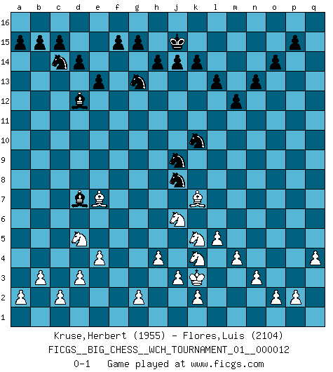Last move : 0-1 2019 February 3 2:39:41 [Event "FICGS__BIG_CHESS__WCH_TOURNAMENT_01__000012"] [Site "FICGS"] [Date "2018.11.02"] [Round "1"] [White "Kruse,Herbert"] [Black "Flores,Luis"] [Result "0-1"] [WhiteElo "1955"] [BlackElo "2104"] 1.m2-m4 j15-k13 2.p1-o3 m15-m13 3.j2-k4 e15-e13 4.e2-e4 p16-o14 5.b1-c3 h15-g13 6.f1-b5 b16-c14 7.h1-l4 n15-n13 8.l1-p5 o16-l13 9.d2-d3 f16-b12 10.c1-l9 k16-h15 11.n2-n3 d15-d14 12.l4-p8 l16-p12 13.o1-j6 q15-q13 14.g1-j2 l13-n11 15.l9-k10 n11-m12 16.h2-g4 h16-k14 17.k10-m12 k14-m12 18.k1-h2 g16-j15 19.e1-e3 c16-h11 20.b5-h11 g13-h11 21.e3-f3 h15-g13 22.f3-f5 j15-h13 23.f5-m5 m12-j12 24.j6-f9 j12-j9 25.f9-a4 q16-q14 26.p5-o4 j9-k10 27.m1-m3 q14-p14 28.p8-a8 j16-j15 29.o4-p5 k10-k9 30.a8-h8 k13-m12 31.m3-k3 k9-j9 32.h8-j9 h11-j9 33.a1-e1 p12-n10 34.k3-l3 l15-l14 35.l3-l9 j9-k11 36.l9-g9 b12-c13 37.g9-g6 e16-e14 38.q2-q4 j15-h15 39.a4-b3 o14-n12 40.m5-k5 n12-m10 41.e1-e3 e14-f14 42.e3-f3 f14-f3 43.h2-f3 a16-e16 44.q1-q3 e16-e14 45.q3-p3 m16-m14 46.j2-h4 e14-f14 47.g6-f6 f14-f6 48.g4-f6 h15-j15 49.p5-o4 p14-p3 50.o4-p3 m14-p14 51.k5-p5 p14-p5 52.o3-p5 m10-n8 53.p3-n5 k11-l9 54.p5-o7 l9-m7 55.n5-q8 k15-k14 56.b3-a4 j15-k15 57.o7-m8 n10-m11 58.a4-g10 n8-l9 59.c3-d5 m12-k11 60.f3-g5 h13-f12 61.g10-l6 m7-k8 62.l6-m5 m13-m12 63.q8-n5 l9-m7 64.n5-l7 k11-l9 65.g5-j6 k8-m9 66.l7-h10 l14-l13 67.h4-k5 c13-k6 68.m8-k7 k6-f2 69.k7-l9 m7-l9 70.m5-h9 o15-o14 71.h3-h4 f2-d4 72.b2-b3 m9-k10 73.h9-m13 k15-j15 74.j1-j2 d4-e5 75.f6-d7 e5-a9 76.l2-l4 l9-j8 77.h10-e7 a9-d12 78.l4-l5 m11-l12 79.m13-o11 l12-e6 80.j2-k3 e6-d7 81.o11-q13 f12-h11 82.q13-k7 h11-j9 0-1 Follow this game move after move (download)If a ruler does not understand Chess, how can he rule over a kingdom ? (King Khusros II) Wie kann ich Remis annehmen? Ich weiß ja gar nicht, wie ich stehe! (Fritz Sämisch) No hay un Gran Maestro de Ajedrez que sea normal; solo se diferencían ellos por la magnitud de su locura. (Viktor Korchnoi) Dans le domaine de la peinture, de la gravure et de la sculpture, dès la première décennie de notre siècle, les artistes abandonnent la représentation de la partie d'échecs pour se concentrer sur les pièces, sur les échiquiers et sur toutes les variations auxquelles les unes et les autres peuvent donner lieu. On passe en quelque sorte d'un thème social à un thème musical (au sens de la musica médiévale, c'est-à-dire d'une notion qui inclue le rythme, l'harmonie, la construction et la déconstruction, etc.). Graphiquement et picturalement, l'échiquier apparaît comme une structure ouverte, dynamique, d'une richesse infinie, autorisant toutes les combinatoires et débouchant sur des mouvements et des rythmes de nature exponentielle. (Michel Pastoureau) There are 10 types of people in this world: those who understand binary and those who don't. (Anonymous)