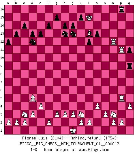 Last move : 1-0 2019 April 17 15:9:32 [Event "FICGS__BIG_CHESS__WCH_TOURNAMENT_01__000012"] [Site "FICGS"] [Date "2018.11.02"] [Round "1"] [White "Flores,Luis"] [Black "Aahlad,Yeturu"] [Result "1-0"] [WhiteElo "2104"] [BlackElo "1754"] 1.j2-k4 j15-k13 2.m2-m4 h16-o10 3.h2-g4 e15-e13 4.p1-o3 f16-b12 5.k1-h2 d15-d13 6.e2-e4 c16-h11 7.b1-c3 k16-l14 8.h1-k3 b16-c14 9.f1-c4 m15-m13 10.d2-d3 n15-n13 11.l1-p5 g16-f14 12.c1-l9 l16-p12 13.n2-n3 c14-d12 14.o1-g8 p16-o14 15.g1-j2 f14-h13 16.e1-e3 e16-e14 17.e3-f3 e14-f14 18.l9-f14 h15-f14 19.m1-m3 o16-f8 20.m3-l3 a15-a13 21.a1-e1 o10-b10 22.c4-b3 b15-b13 23.q1-m1 a16-a14 24.f3-f5 f14-e12 25.e1-e3 f15-f14 26.e3-f3 f8-k12 27.l3-l5 o14-n12 28.m1-m3 q15-q13 29.m3-l3 l14-j13 30.l5-l10 b10-b8 31.j2-h4 a14-c14 32.k3-f7 l15-l14 33.g8-j10 h11-e8 34.f7-m7 e8-j12 35.l10-l5 j12-m9 36.f5-b5 b8-p8 37.m7-a7 c14-c8 38.q2-q4 m9-k7 39.l5-l7 c8-a8 40.a7-b7 k7-f11 41.b7-b9 m16-m14 42.b3-d5 a8-d8 43.b9-a9 k12-d6 44.a9-a10 c15-c14 45.b5-b12 a13-a12 46.b12-b6 d6-c5 47.b6-o6 o15-o13 48.a10-a11 j16-j15 49.f3-f6 p15-p13 50.o6-p6 p8-k8 51.p5-l9 k8-g11 52.p6-g6 g11-e9 53.l9-k10 m14-n14 54.l7-l9 e9-d10 55.k10-g7 d10-b8 56.a11-c9 b8-c9 57.l9-c9 c5-j11 58.f6-c6 d8-p8 59.g6-p6 p8-o8 60.g4-f6 k13-l11 61.j10-h9 p12-m9 62.p6-p7 f11-g12 63.p7-p9 m9-n10 64.h4-f5 h13-g11 65.h9-g8 e12-f10 66.g8-f7 l14-l13 67.k4-h5 l13-l12 68.h5-j7 n14-k14 69.l3-l11 n12-l11 70.g7-l11 o8-o7 71.l11-n13 q16-p16 72.n13-m12 o7-j7 73.m12-k14 j15-k14 74.p9-p10 g12-l8 75.f6-g8 f10-g8 76.f7-g8 n10-o11 77.p10-p9 j11-l13 78.p9-p5 l13-j11 79.p5-n5 o11-n12 80.h2-k3 j7-q7 81.g2-g3 l8-k9 82.c6-c7 q7-q10 83.c7-k7 k14-l15 84.f5-g7 j11-h10 85.n5-k5 k9-l10 86.k7-p7 h10-l13 87.k5-p5 p13-p12 88.g7-h9 g11-h13 89.h9-k8 l13-k12 90.p7-c7 q13-q12 91.k8-l10 n12-l10 92.g8-h7 l10-h7 93.c7-h7 o13-o12 94.c9-p9 p12-p11 95.h7-o7 k12-l13 96.p9-p10 q10-q9 97.o7-o12 q12-q11 98.p10-p11 1-0 Follow this game move after move (download)I believe that Chess possesses a magic that is also a help in advanced age. A rheumatic knee is forgotten during a game of Chess and other events can seem quite unimportant in comparison with a catastrophe on the chessboard. (Vlastimil Hort) Vielleicht wirkt die Aura früherer Spieler glanzvoller als die der heutigen Spieler, aber das liegt daran, dass man kein Programm wie Fritz hatte, das einem all die Löcher in ihren Partien zeigt. (Vladimir Kramnik) Debió haber existido una vez en que los hombres eran semidióses, de otra manera no hubiesen podido inventar el Ajedrez. (Gustav Schenk) Vouloir jouer aux échecs contre soi-même est aussi paradoxal que vouloir marcher sur son ombre. (Stefan Zweig) Watch your thoughts; they become words. Watch your words; they become actions. Watch your actions; they become habits. Watch your habits; they become character. Watch your character; it becomes your destiny. (Frank Outlaw)