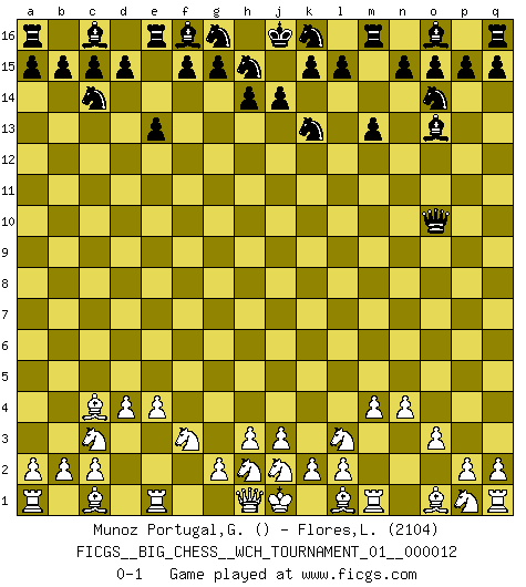 Last move : 0-1 2018 December 28 3:38:36 [Event "FICGS__BIG_CHESS__WCH_TOURNAMENT_01__000012"] [Site "FICGS"] [Date "2018.11.02"] [Round "1"] [White "Munoz Portugal,Guillermo"] [Black "Flores,Luis"] [Result "0-1"] [WhiteElo ""] [BlackElo "2104"] 1.e2-e4 j15-k13 2.b1-c3 h16-o10 3.k1-l3 o10-f2 4.g1-f3 f2-o10 5.f1-c4 m15-m13 6.n2-n4 e15-e13 7.o2-o3 p16-o14 8.d2-d4 b16-c14 9.m2-m4 l16-o13 0-1 This big chess game has been lost on time (started : 2018.11.02 20:27:3) Follow this game move after move (download)Life is a kind of Chess, with struggle, competition, good and ill events. (Benjamin Franklin) Im Hotelzimmer gab es nur zwei Schaben. (Über die Turnierbedingungen) (Peter Swidler) Una de estas pequeñas movidas modestas pudieran ser mas molestas a tu oponente que la amenaza mas grande. (Siegbert Tarrasch) Les Echecs ne sont pas pour les âmes timides. Ils requièrent un homme entier, qui ne s'arrête pas aveuglément à ce qui a été déjà établi, mais qui tente individuellement de sonder les profondeurs du jeu. (W. Steinitz) Thibault, I ask for draw. Game 13876. - Sorry Ilmars, you won. (FICGS chat)
