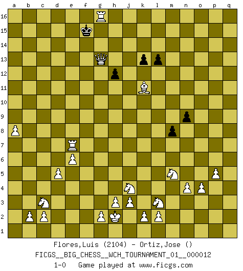 Last move : 1-0 2019 May 25 3:51:48 [Event "FICGS__BIG_CHESS__WCH_TOURNAMENT_01__000012"] [Site "FICGS"] [Date "2018.11.02"] [Round "1"] [White "Flores,Luis"] [Black "Ortiz,Jose"] [Result "1-0"] [WhiteElo "2104"] [BlackElo ""] 1.j2-k4 n15-n14 2.e2-e4 o16-j11 3.h1-o7 h14-h13 4.o7-o15 p16-n15 5.o15-p15 n15-o13 6.p15-j9 j11-c5 7.h2-g4 e15-e13 8.m2-m4 c5-f2 9.g4-f2 f16-d14 10.p1-o3 e13-e12 11.j9-e9 j15-k13 12.l1-o4 k15-k14 13.o4-d14 c15-d14 14.b1-c3 h16-j15 15.f1-b5 j15-b8 16.e4-e5 b8-m8 17.e1-f1 f15-f13 18.d2-d3 l16-k15 19.c1-f4 q16-p16 20.p2-p3 m8-g8 21.f2-g4 g8-g12 22.k1-h2 e16-e13 23.g1-j2 b15-b14 24.o1-p2 c16-b15 25.o3-n5 b16-c14 26.f1-f3 a16-f16 27.a1-f1 p16-p11 28.f4-m10 c14-d12 29.f3-f12 d12-f11 30.f12-g12 f11-e9 31.g12-g15 g16-f14 32.g15-g9 e9-f11 33.g9-a9 a15-a14 34.m10-f16 h15-f16 35.a9-d9 d14-d13 36.m1-m3 p11-o11 37.o2-o4 f16-h15 38.h2-j4 f13-f12 39.m3-l3 l15-l13 40.l3-l7 m15-m14 41.l7-e7 o11-m11 42.j1-h2 e12-e11 43.p2-f11 m11-m4 44.e7-m7 m4-m7 45.n5-m7 e11-e10 46.d9-j9 o13-m12 47.f1-f6 k13-h12 48.f11-o3 m12-k11 49.j9-n9 k11-m12 50.f6-f12 h12-g14 51.f12-f6 f14-g12 52.q1-f1 j16-j15 53.f6-f13 e13-f13 54.f1-f13 g12-e11 55.f13-f10 n14-n13 56.f10-e10 e11-f13 57.e10-e6 j15-h14 58.n9-d9 b14-b13 59.o3-d13 b15-d13 60.d9-d13 f13-g15 61.d13-d15 k16-l14 62.e6-q6 l14-j13 63.q6-q15 k15-n12 64.q15-p15 m16-q16 65.q2-q4 q16-q7 66.m7-l9 m12-n14 67.p15-p5 q7-l7 68.l9-n8 l7-n7 69.p5-n5 n7-m7 70.n8-l9 m7-l7 71.n5-n12 l7-l9 72.j2-l3 n14-p13 73.n12-p12 p13-o11 74.d15-a15 o11-q10 75.p12-p10 q10-o11 76.a15-a14 o11-q12 77.p10-p12 q12-o11 78.a14-b14 l9-m9 79.b14-b13 m9-n9 80.a2-a4 n9-n3 81.k4-m5 n3-n8 82.g4-h6 g15-e14 83.n2-n4 o11-q10 84.p12-p14 e14-d12 85.b13-b10 m14-m13 86.b10-q10 d12-f11 87.q4-q5 m13-m12 88.q5-q6 n13-n12 89.q6-q7 n12-n11 90.p14-p8 n8-n9 91.q7-q8 n9-e9 92.d3-d4 e9-d9 93.d4-d5 f11-h10 94.q10-h10 j13-k11 95.h10-e10 d9-q9 96.e10-e14 h15-g13 97.e14-a14 k11-j13 98.a4-a5 m12-m11 99.a5-a6 n11-n10 100.a6-a7 g13-e12 101.a7-a8 e12-c13 102.a14-a11 m11-m10 103.p3-p4 c13-e12 104.p4-p5 q9-e9 105.e5-e6 e9-f9 106.b5-f9 e12-d10 107.f9-g10 d10-c12 108.a11-c11 c12-e13 109.q8-q9 g14-h12 110.g10-e12 k14-k13 111.q9-q10 j13-l14 112.q10-q11 l14-n13 113.q11-q12 n13-o15 114.q12-q13 o15-q14 115.p8-p14 q14-o15 116.c11-c15 o15-q16 117.p14-p15 m10-m9 118.q13-q14 h12-g14 119.q14-q15 n10-n9 120.h6-j8 m9-m8 121.j8-k10 g14-f16 122.p15-p16 f16-e14 123.c15-e15 q16-o15 124.e15-e14 h14-g13 125.e14-e13 g13-f12 126.e13-e15 j14-j13 127.e12-h9 j13-j12 128.h9-o15 j12-j11 129.p16-g16 f12-f13 130.q15-q16 f13-f14 131.e15-e7 j11-k10 132.q16-k10 f14-f15 133.k10-g13 h13-h12 134.o15-k11 1-0 Follow this game move after move (download)Chess is ruthless: you've got to be prepared to kill people. (Nigel Short) Frage des Reporters: -Welche besonderen Umstände rechtfertigen das Anhalten der Uhren während einer Turnierpartie? Antwort: -Einen Fotographen zu strangulieren. (Siegbert Tarrasch) Un jugador que es sorprendido, esta derrotado a medias. (Proverbio) Comme les marins qui ont mille raisons différentes d'aller en mer, les joueurs d'échecs en ont tout autant avant de s'installer devant une table et jouer... (Vincent Bertignac, philosophe) Art is the triumph over chaos. (John Cheever)