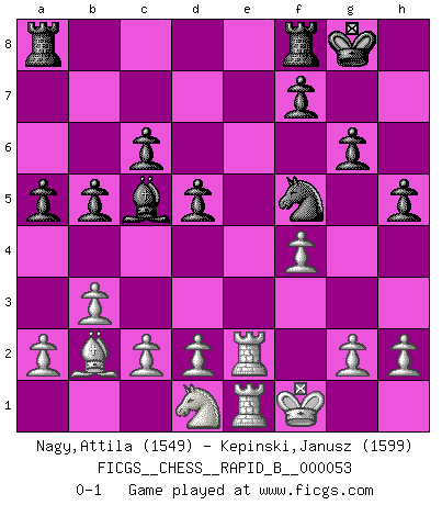 Last move : 0-1 2007 September 27 16:14:19 [Event "FICGS__CHESS__RAPID_B__000053"] [Site "FICGS"] [Date "2007.05.23"] [Round "1"] [White "Nagy,Attila"] [Black "Kepinski,Janusz"] [Result "0-1"] [WhiteElo "1549"] [BlackElo "1599"] 1.e4 e6 2.b3 b6 3.Bb2 Bb7 4.Nc3 Be7 5.f4 Nh6 6.Nf3 O-O 7.Bd3 Ng4 8.Qe2 Bc5 9.Na4 Be7 10.O-O Nc6 11.Nd4 Nh6 12.Rf3 Nxd4 13.Bxd4 d5 14.Rg3 g6 15.Bb2 dxe4 16.Bxe4 Bxe4 17.Qxe4 Qd5 18.Qxd5 exd5 19.Re3 Nf5 20.Re2 h5 21.Rae1 b5 22.Nc3 Bc5+ 23.Kf1 c6 24.Nd1 a5 0-1 This chess game has been lost on time (started : 2007.05.23 22:9:31) French : Reti (Spielmann) variation Kingside Castling by player Black (move 6) Kingside Castling by player White (move 10) Player Black won this chess game. Follow this game move after move (download)I believe that Chess possesses a magic that is also a help in advanced age. A rheumatic knee is forgotten during a game of Chess and other events can seem quite unimportant in comparison with a catastrophe on the chessboard. (Vlastimil Hort) Früher wurde jeder komplizierte Zug, jedes interessante Opfer mit großem Beifall und Enthusiasmus aufgenommen. Heute schaltet man einfach seinen Fritz an, und man kann sehen, was los ist, ob der Zug geht oder nicht. (Vladimir Kramnik) Los problemas de Ajedrez exigen del compositor las mismas virtudes que caracterizan todo el arte de valor: originalidad, invención, concisión, armonía, complejidad e insinceridad explendida. (Vladimir Nabokov) C'est la seule position que je connaisse où les deux camps sont mals. Propos prêtés à V. Anand. 'preceded by its own quotation yields a falsehood' preceded by its own quotation yields a falsehood. (W. V. O. Quine - Set Theory And Its Logic, 1953)