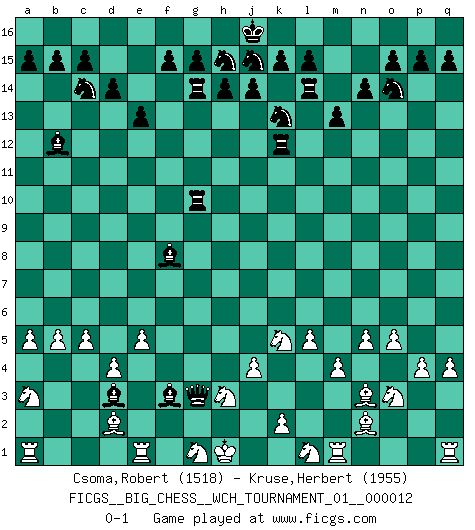 Last move : 0-1 2018 December 1 15:51:9 [Event "FICGS__BIG_CHESS__WCH_TOURNAMENT_01__000012"] [Site "FICGS"] [Date "2018.11.02"] [Round "1"] [White "Csoma,Robert"] [Black "Kruse,Herbert"] [Result "0-1"] [WhiteElo "1518"] [BlackElo "1955"] 1.a2-a4 m15-m13 2.e2-e4 j15-k13 3.m2-m4 h16-o10 4.g2-g3 b16-c14 5.o2-o3 p16-o14 6.q2-q4 e15-e13 7.c2-c3 f16-b12 8.b2-b4 l16-p12 9.d2-d4 n15-n14 10.f2-f4 d15-d14 11.c1-d2 c16-l8 12.g3-g4 o16-f8 13.j3-j4 h15-g13 14.l2-l4 m16-m14 15.n2-n4 e16-e14 16.p2-p4 g16-j15 17.b1-a3 k16-h15 18.f1-d3 e14-f14 19.h2-f3 m14-l14 20.k1-j3 a16-e16 21.h1-g2 f14-f10 22.o1-n2 e16-e14 23.l1-n3 e14-g14 24.a4-a5 g13-h11 25.b4-b5 l14-l12 26.c3-c4 f10-g10 27.c4-c5 l12-k12 28.e4-e5 o10-k6 29.j3-k5 q16-m16 30.o3-o4 m16-m14 31.f4-f5 m14-l14 32.l4-l5 k6-n9 33.n4-n5 h11-j9 34.o4-o5 j9-k7 35.p1-o3 k7-j5 36.j2-l1 j5-h3 37.g1-h3 l8-g4 38.f3-g1 g4-f5 39.g2-f1 n9-g3 40.j1-h1 f5-d3 41.f1-f3 p12-f3 0-1 Follow this game move after move (download)In complicated positions, Bobby Fischer hardly had to be afraid of anybody. (Paul Keres) Je mehr ich von der FIDE weiss, um so weniger verstehe ich. (Alexander Kalifman) Alguna parte de un error es siempre correcto. (Savielly Tartakover) Aux échecs, les retours au sommet sont rares : les dommages psychologiques consécutifs à une défaite sont trop sévères. (Daily Telegraph) Memory is a way of holding onto the things you love, the things you are, the things you never want to lose. (from the television show: The Wonder Years)