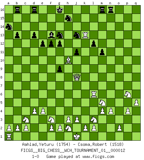 Last move : 1-0 2019 March 3 19:29:2 [Event "FICGS__BIG_CHESS__WCH_TOURNAMENT_01__000012"] [Site "FICGS"] [Date "2018.11.02"] [Round "1"] [White "Aahlad,Yeturu"] [Black "Csoma,Robert"] [Result "1-0"] [WhiteElo "1754"] [BlackElo "1518"] 1.j2-k4 q15-q13 2.h1-o7 g15-g14 3.o7-o15 q13-q12 4.m2-m4 p16-q14 5.o15-o12 m15-m14 6.o12-q12 l15-l13 7.d2-d4 k15-k13 8.c1-p13 j15-l14 9.e2-e4 q14-o15 10.q12-o12 o15-p13 11.o12-p13 j14-j13 12.f1-b5 l16-j14 13.p13-k8 h16-k14 14.k8-c15 p15-p13 15.b5-g10 b16-a14 16.c15-k8 p13-p12 17.k8-k7 a16-b16 18.k7-p12 h14-h13 19.n2-n4 g14-g13 20.e1-e3 f15-f13 21.p12-l8 e15-e14 22.e3-g3 d15-d13 23.o1-b13 e16-d16 24.l1-o4 f13-f12 25.g1-f3 e14-e13 26.l8-b8 a14-c15 27.b13-f9 b15-b13 28.b8-e8 e13-e12 29.g10-k13 j14-k13 30.f9-k13 g16-h14 31.k13-g10 n15-n13 32.e8-h8 h13-h12 33.h8-a15 c15-a14 34.a15-h8 m14-m13 35.m1-m3 k16-j14 36.b1-c3 f16-e15 37.m3-k3 o16-n15 38.k4-m5 k14-l15 39.p1-o3 n13-n12 40.o3-n5 m13-m12 41.g3-g7 n12-n11 42.g7-o7 m12-m11 43.p2-p4 l13-l12 44.q2-q4 j13-j12 45.q4-q5 g13-g12 46.q1-q3 j12-j11 47.q3-l3 l14-j13 48.o7-o15 l15-m14 49.h8-o8 h12-h11 50.o8-o11 j16-h16 51.o11-n11 h16-g16 52.o15-n15 h11-g10 53.n15-n14 m14-q10 54.n14-j14 h14-j12 55.k3-k13 e15-h12 56.l3-l6 q16-n16 57.n11-k8 j12-g13 58.j14-h14 h12-g11 59.k8-j8 q10-h10 60.h14-h10 g11-h10 61.k1-l3 g10-g9 62.n5-p6 c16-f13 63.o4-h10 1-0 Follow this game move after move (download)The beauty of a move lies not in its' appearance but in the thought behind it. (Siegbert Tarrasch) Wenn ich mich einlogge, glauben die Leute gewöhnlich nicht, dass ich es selbst bin und sie fangen an, mir dumme Fragen zu stellen. Und wenn sie es glauben, stellen sie wieder andere dumme Fragen. (Judith Polgar) El Ajedrez es una guerra en un tablero. El objetivo es aplastar la mente del oponente. (Bobby Fischer) Seul un grand joueur sait à quel point il joue faiblement. (Xavier Tartacover) No man has ever achieved immortality in his own life time. (Unknown)