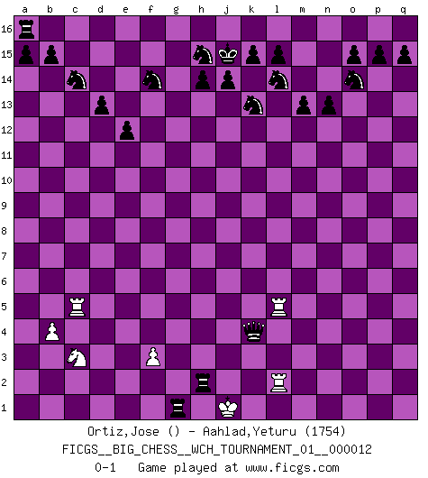 Last move : 0-1 2019 May 1 3:47:16 [Event "FICGS__BIG_CHESS__WCH_TOURNAMENT_01__000012"] [Site "FICGS"] [Date "2018.11.02"] [Round "1"] [White "Ortiz,Jose"] [Black "Aahlad,Yeturu"] [Result "0-1"] [WhiteElo ""] [BlackElo "1754"] 1.p1-o3 j15-k13 2.d2-d4 h16-o10 3.g2-g3 o10-c10 4.j2-k4 c10-c2 5.b1-c3 c2-j8 6.h1-c6 e15-e13 7.m2-m4 f16-b12 8.l1-m2 k16-l14 9.c1-g5 n15-n13 10.f1-g2 o16-f8 11.c6-e8 j8-j9 12.n2-n3 j9-d4 13.g5-e3 d4-j9 14.e8-f7 f8-k4 15.m2-k4 b12-k4 16.f7-f15 g16-f14 17.f15-g15 k4-n7 18.m1-m3 m15-m13 19.g15-g6 d15-d13 20.g6-g15 e13-e12 21.g15-c15 j9-c15 22.a1-c1 c16-k9 23.l2-l4 c15-l7 24.k1-l3 l7-l4 25.o1-n2 n7-l9 26.k2-k3 l4-q9 27.m4-m5 l9-e3 28.f2-e3 q9-p9 29.k3-k4 p9-p2 30.q1-m1 k9-h7 31.n2-o1 p2-o3 32.m3-m2 h7-o1 33.m1-o1 o3-p2 34.o1-m1 m16-m14 35.q2-q4 m14-q14 36.o2-o4 p2-p3 37.m2-m3 q14-q4 38.l3-n2 p3-p2 39.m3-m2 q4-q1 40.n2-l3 p2-m2 41.m1-q1 m2-l3 42.j1-k1 l3-j3 43.q1-q2 j3-n3 44.g1-j2 n3-o4 45.q2-l2 o4-n4 46.k1-k2 n4-m5 47.h2-k3 m5-g5 48.h3-h4 g5-e3 49.g2-f3 p16-o14 50.c3-d5 e3-e5 51.b2-b4 l16-p12 52.g3-g4 b16-c14 53.c1-c5 e16-e13 54.d5-b6 e5-b2 55.b6-d5 b2-a2 56.d5-c3 a2-a7 57.h4-h5 e13-j13 58.j2-h4 j13-j4 59.e1-h1 j4-k4 60.h4-j2 k4-k6 61.h1-h4 a7-k7 62.l2-l3 j16-j15 63.g4-g5 q16-g16 64.h5-h6 k7-p2 65.l3-l2 p2-m5 66.h4-l4 p12-f3 67.e2-f3 g16-g5 68.l4-l5 m5-k3 69.k2-j1 k3-k1 70.j1-h2 k6-h6 71.j2-h4 h6-h4 72.h2-j3 k1-k4 73.j3-j2 h4-h2 74.j2-j1 g5-g1 0-1 Follow this game move after move (download)Tactics flow from a superior position. (Bobby Fischer) Schach ist gnadenlos. Du mußt bereit sein zu töten. (Nigel Short) Cada Peón es una Reina en potencia. (James Mason) Il vaut toujours mieux jouer un plan faux de façon logique que de n'avoir pas de plan du tout. (Victor Kortchnoï) Macintosh - we might not get everything right, but at least we knew the century was going to end. (Douglas Adams)